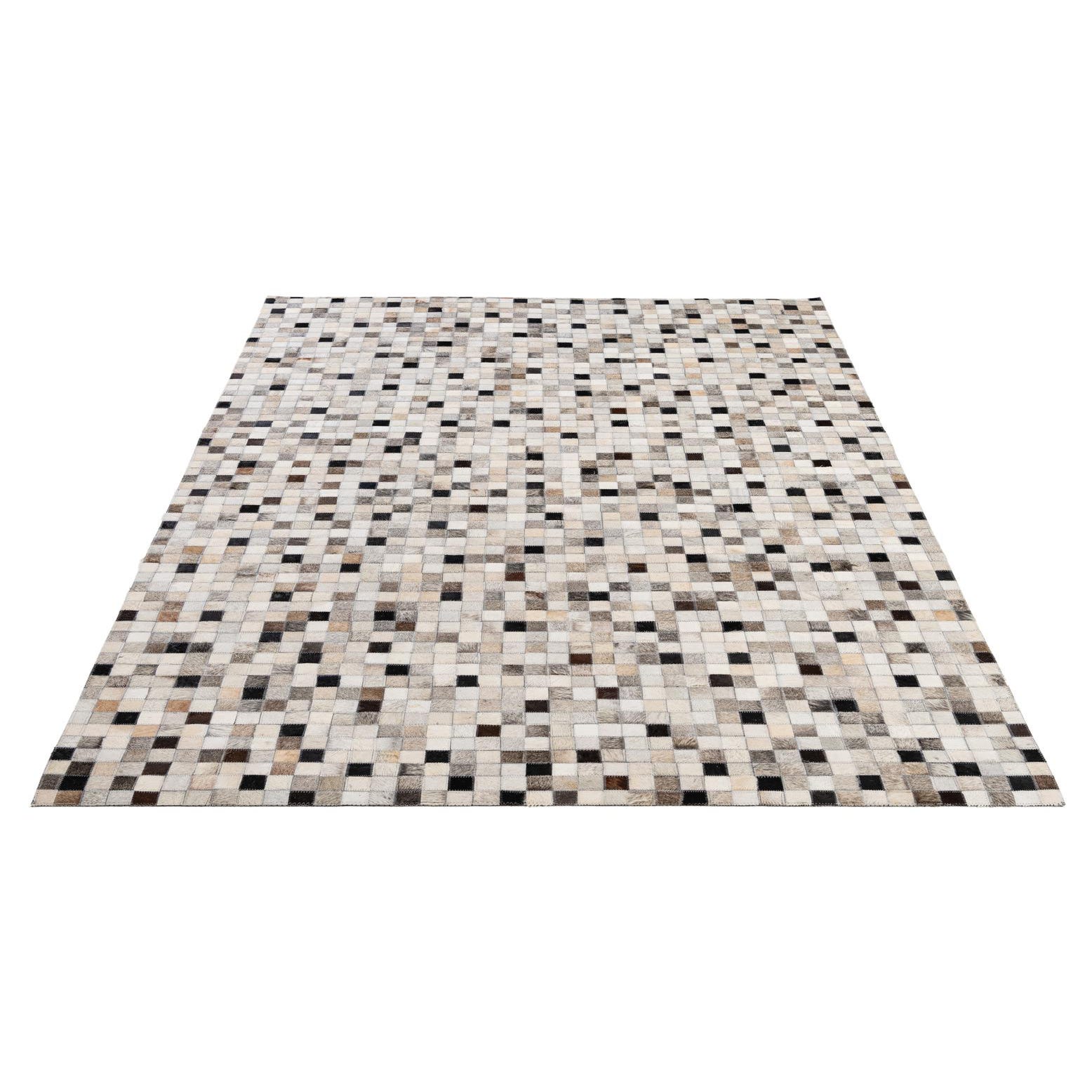 A 5x8 rectangular Cowhide Patchwork rug featuring a modern pattern of multi-colored squares in various shades of brown, black, and white.