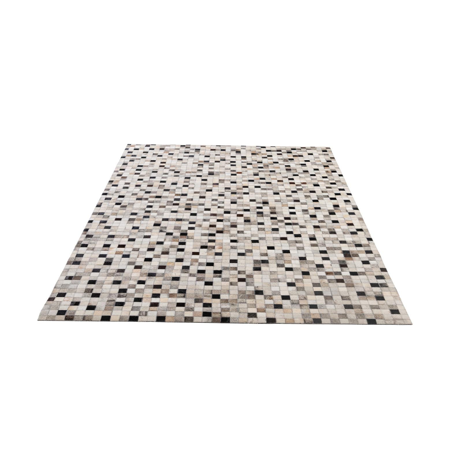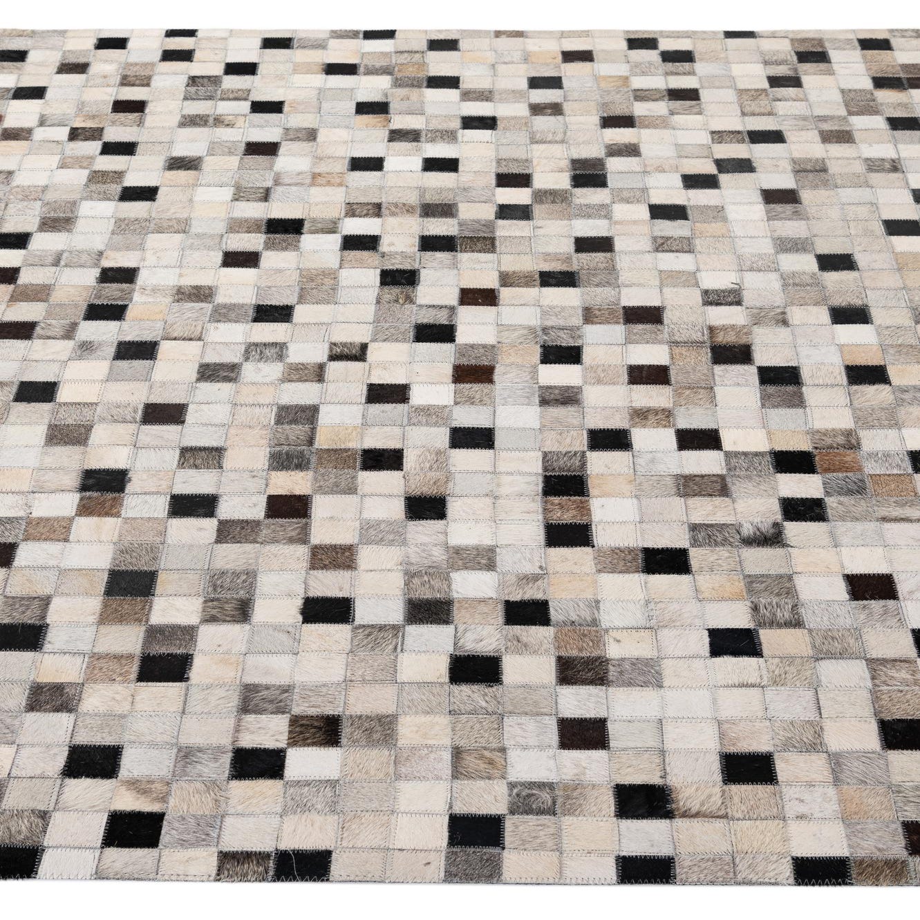 A 5x8 rectangular Cowhide Patchwork rug featuring a modern pattern of multi-colored squares in varying shades of black, brown, and cream.
