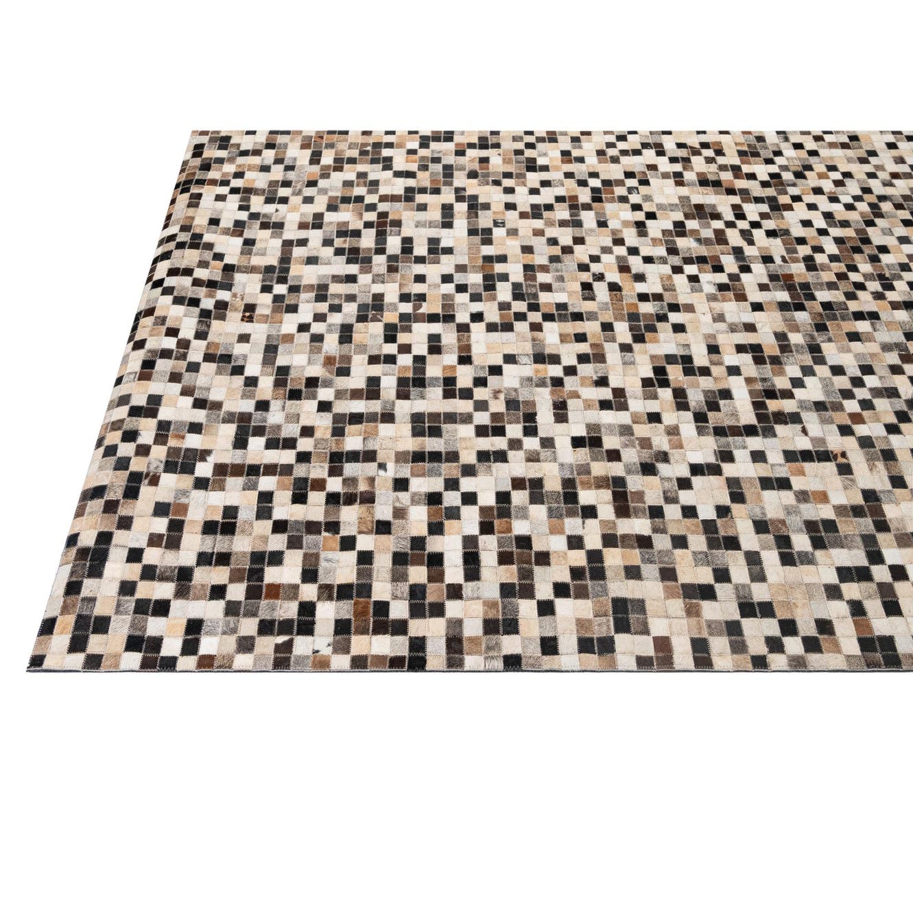 A 5x8 rectangular Cowhide Patchwork rug featuring a modern mosaic pattern of multi-colored squares in black, brown, and cream tones.