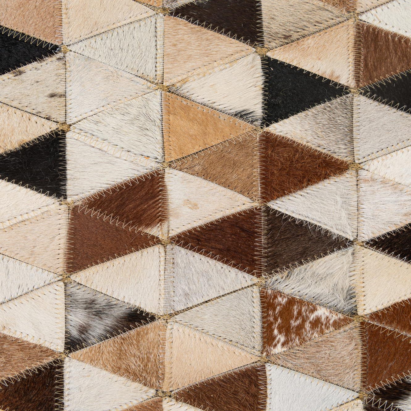 A 5x8 rectangular Cowhide Patchwork rug featuring a modern geometric pattern of multi-colored natural cowhide triangles.