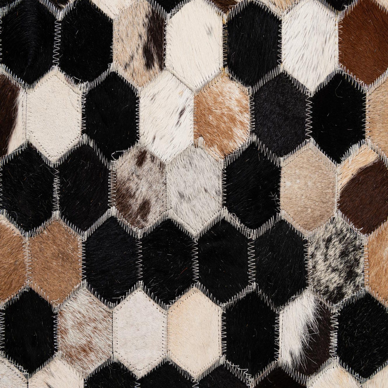 A 5x8 rectangular Cowhide - Patchwork rug featuring a modern honeycomb pattern in multi-colored natural cowhide and black leather.