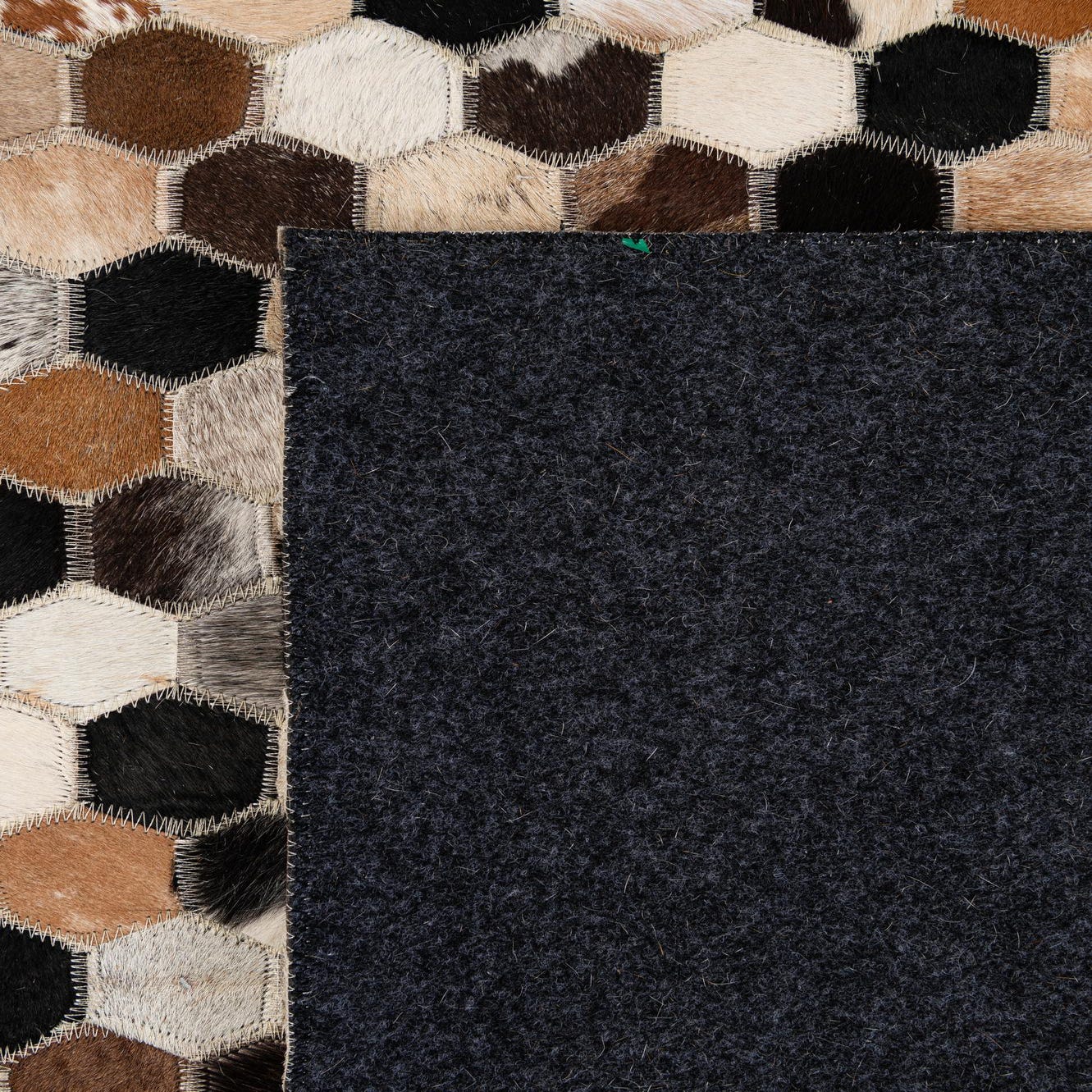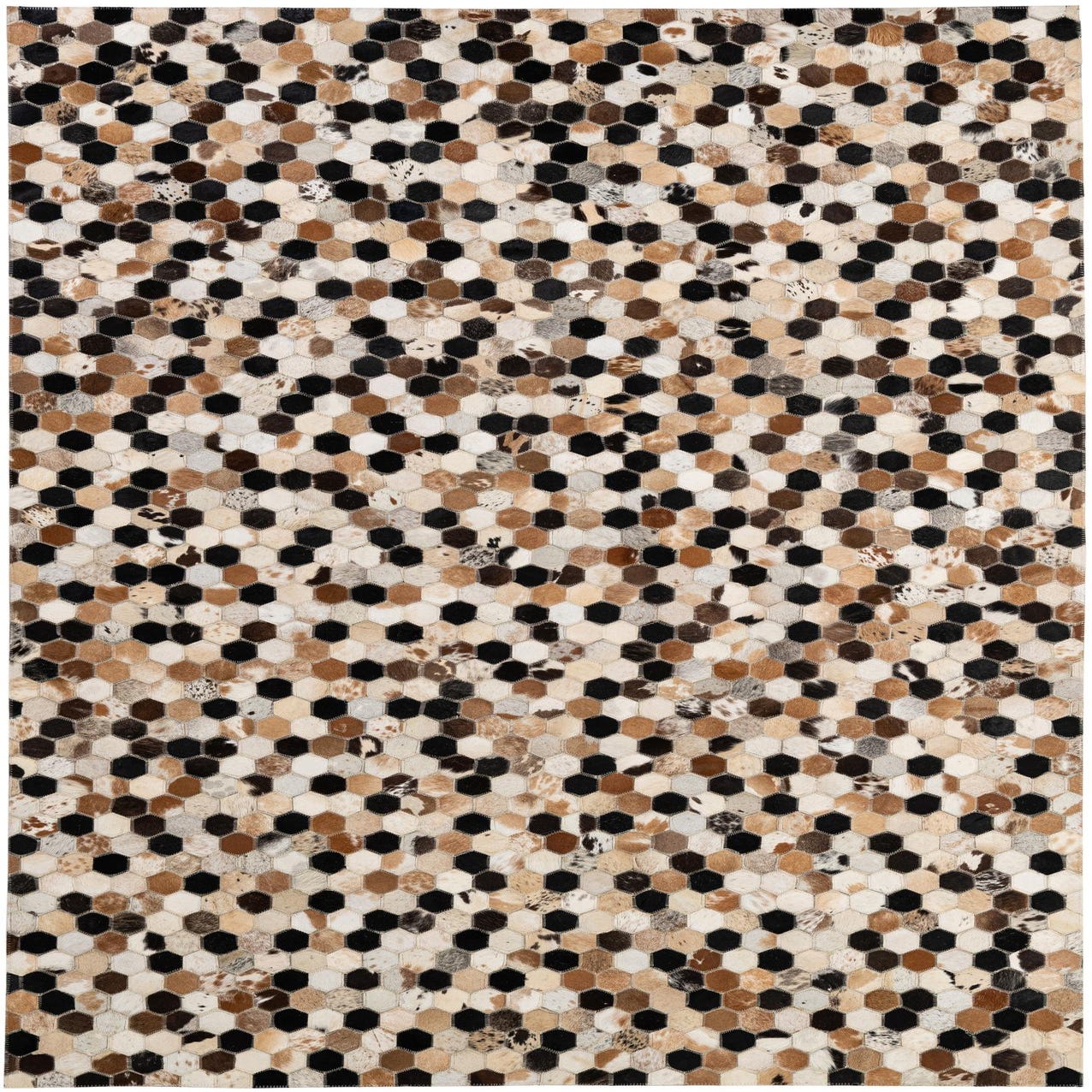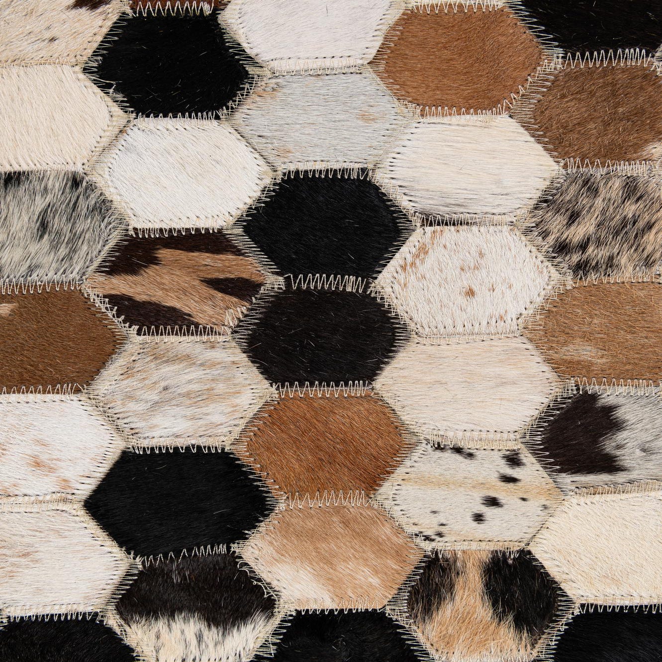 A 5x8 rectangular Cowhide Patchwork rug with a modern hexagonal pattern in various shades of brown, black, and cream.