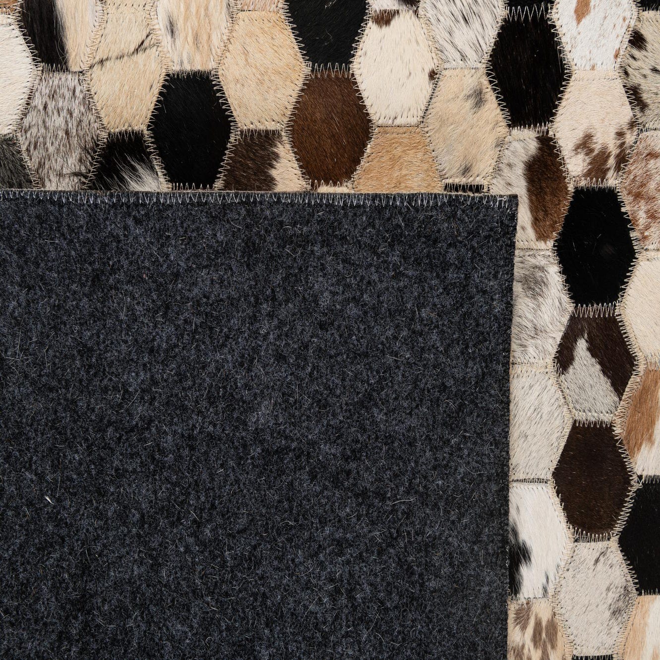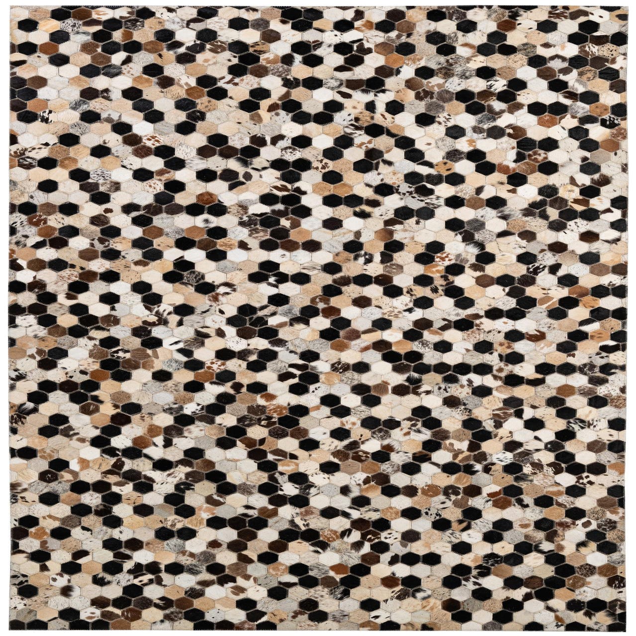 A 5x8 rectangular Cowhide Patchwork rug featuring a modern hexagonal pattern in multi-colored natural cowhide and black leather.