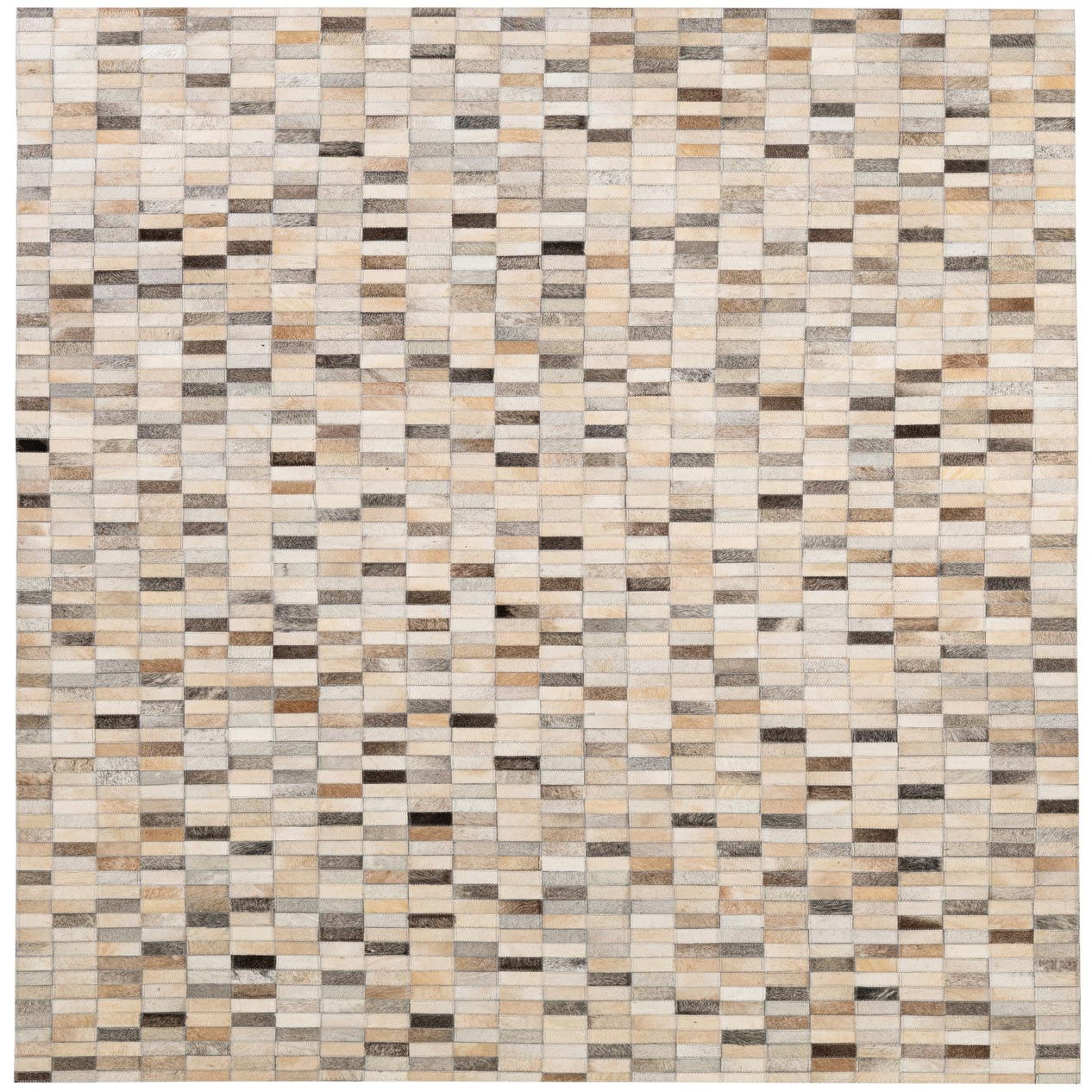 A 5x8 rectangular Cowhide Patchwork rug featuring a modern pattern of multi-colored rectangular leather and cowhide pieces.