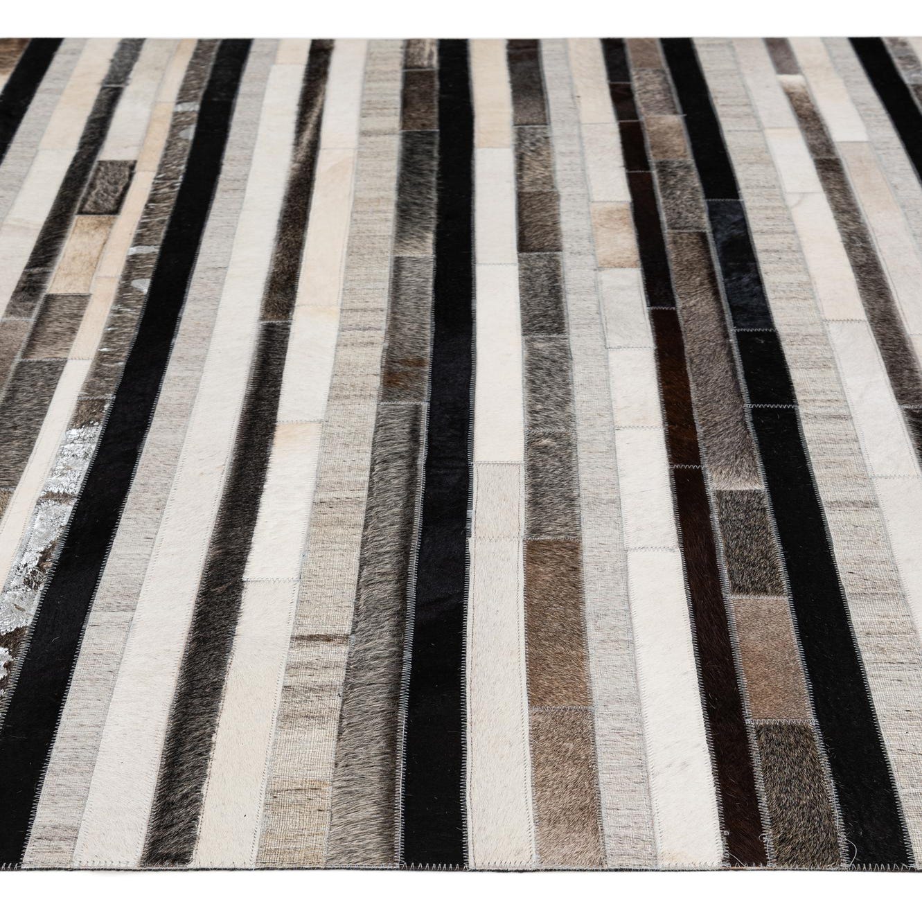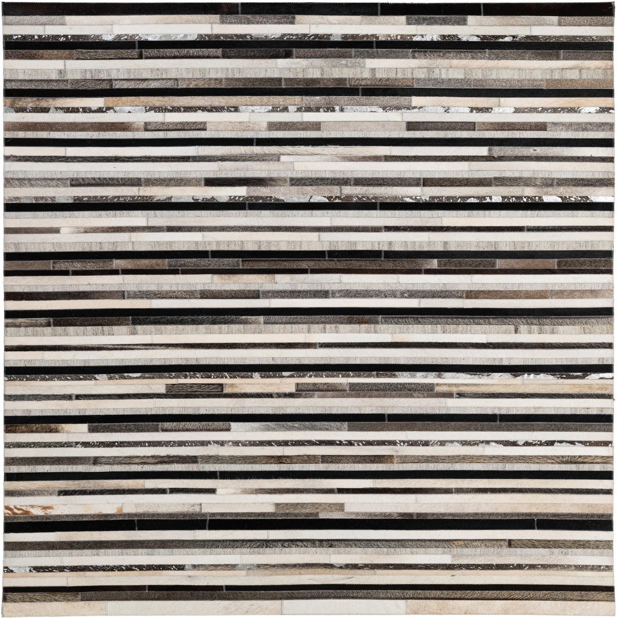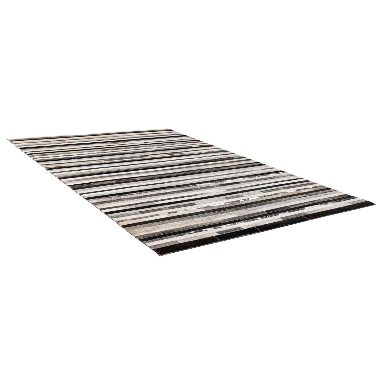 A rectangular 5x8 Cowhide Patchwork rug featuring horizontal stripes of multi-colored cowhide and leather in varying shades of brown, black, white, and silver.