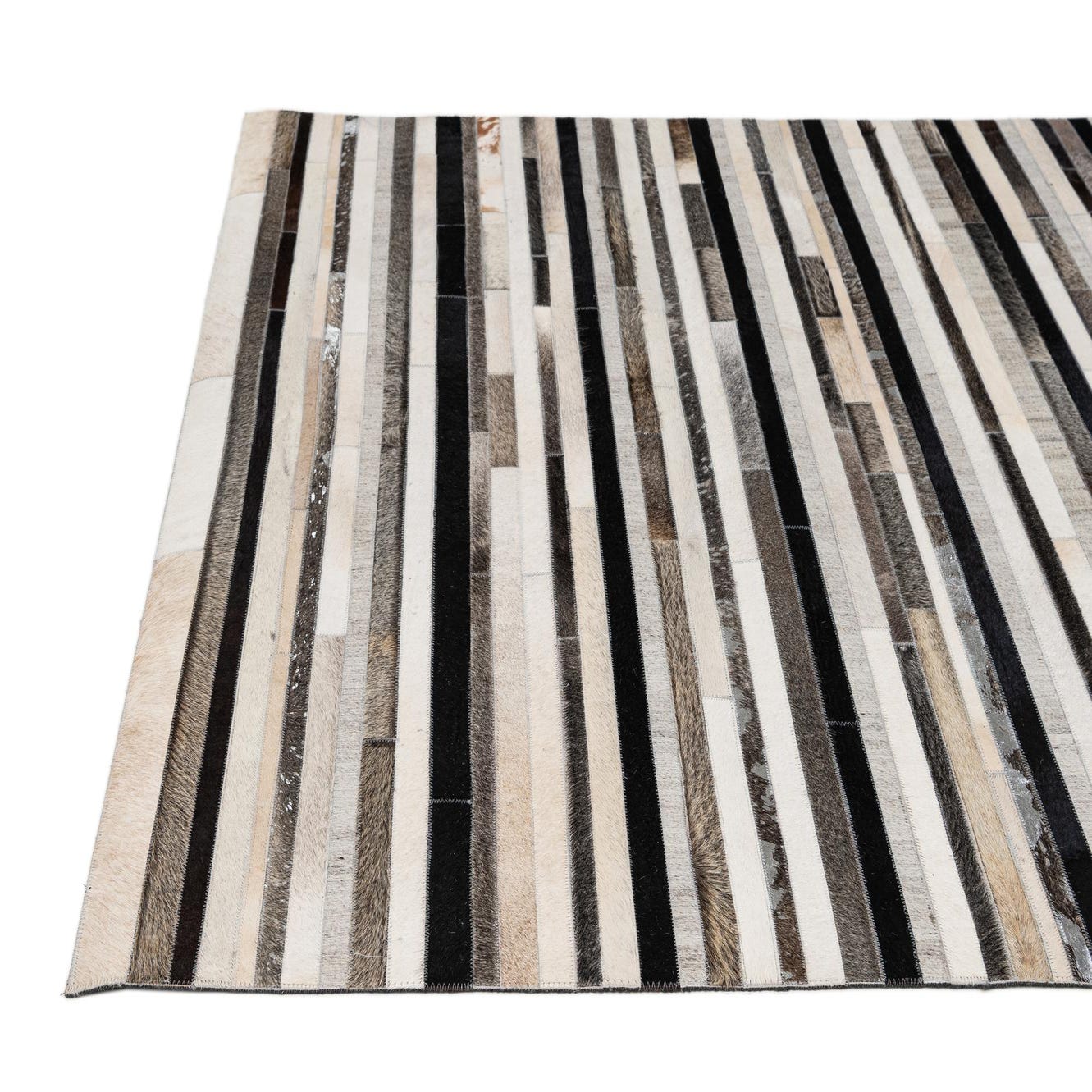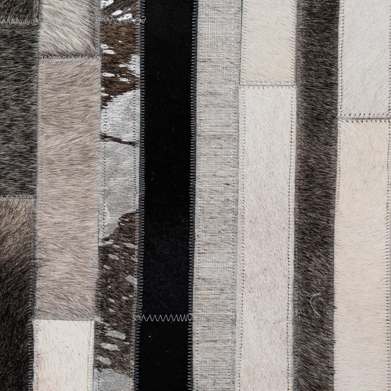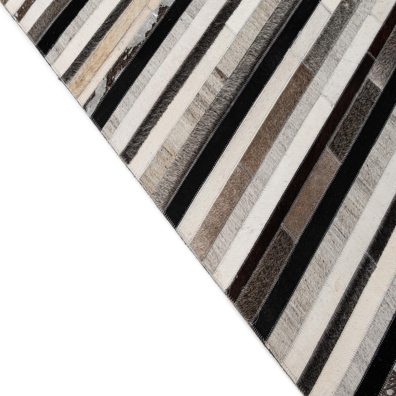 A rectangular 5x8 Cowhide Patchwork rug featuring horizontal stripes of multi-colored cowhide and leather in varying shades of brown, black, white, and silver.