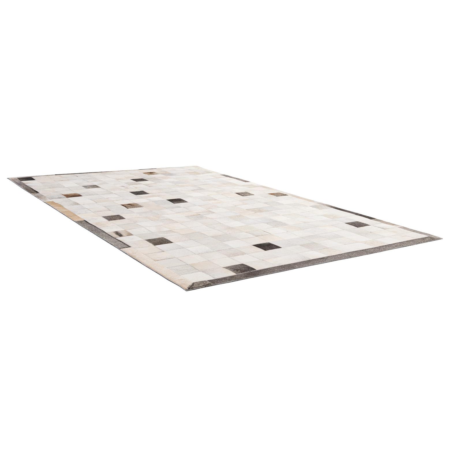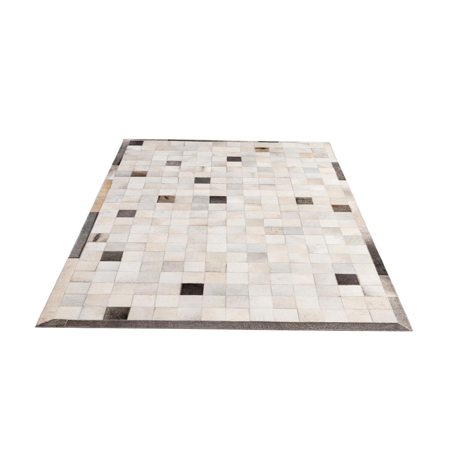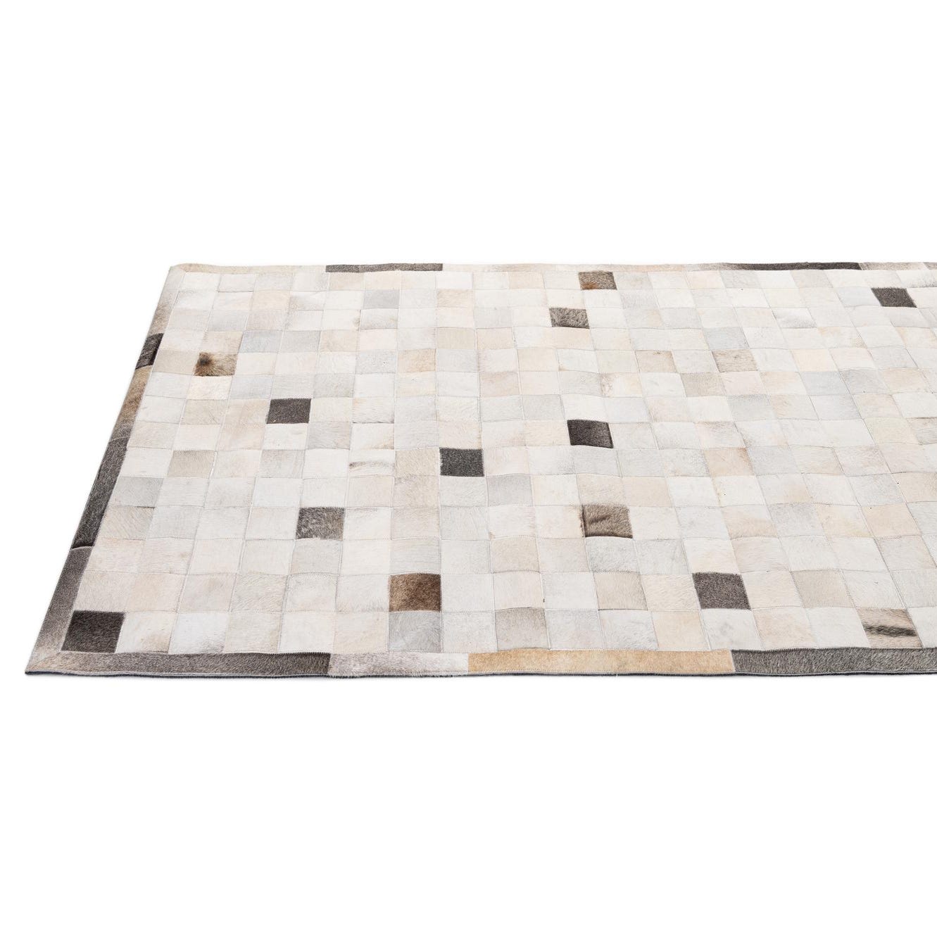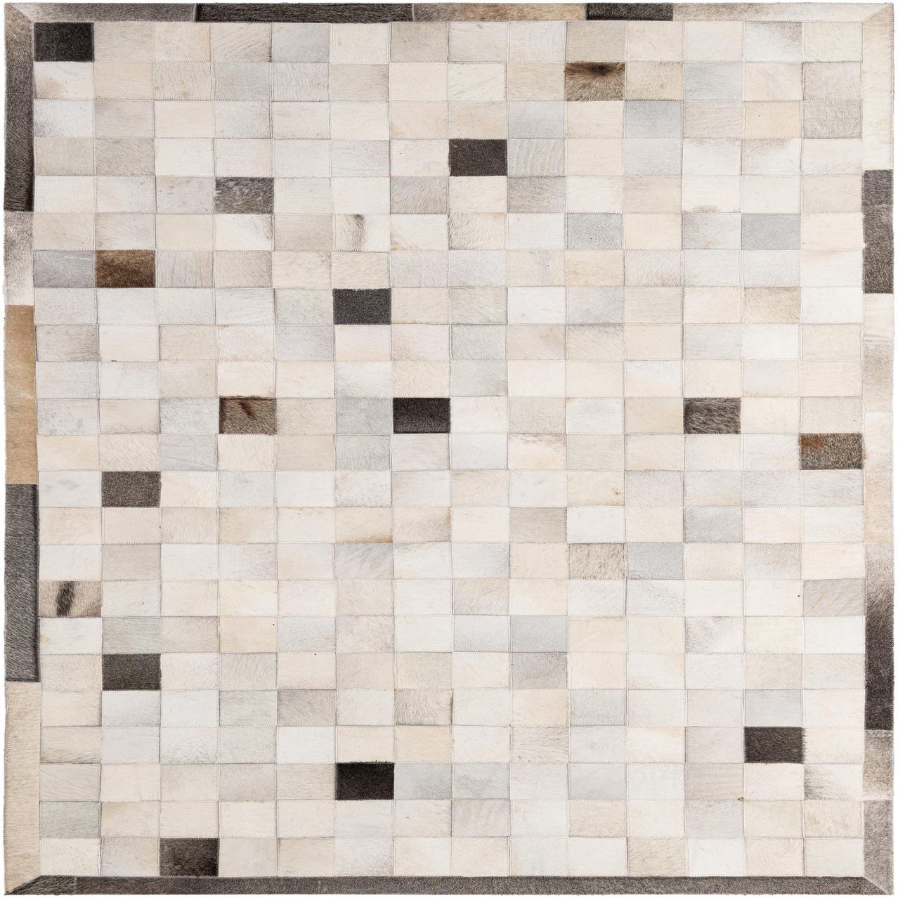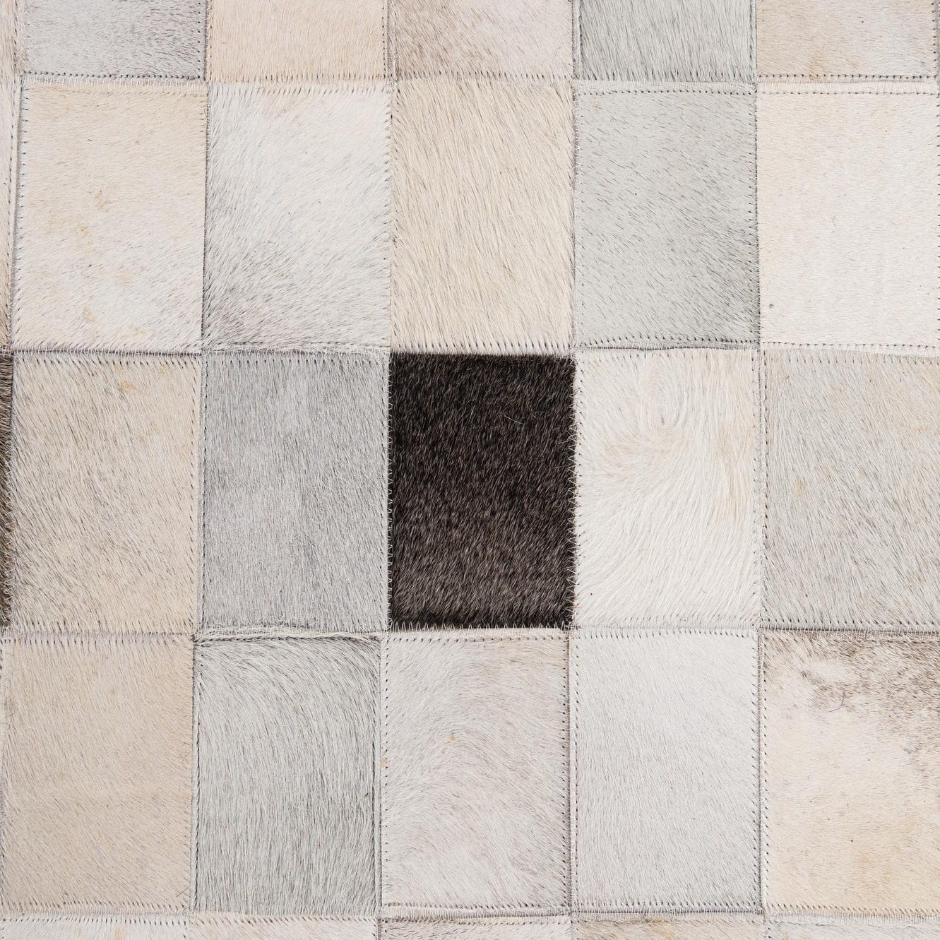 A 5x8 rectangular Cowhide Patchwork rug featuring a modern grid pattern of multi-colored squares in various shades of white, gray, brown, and black.