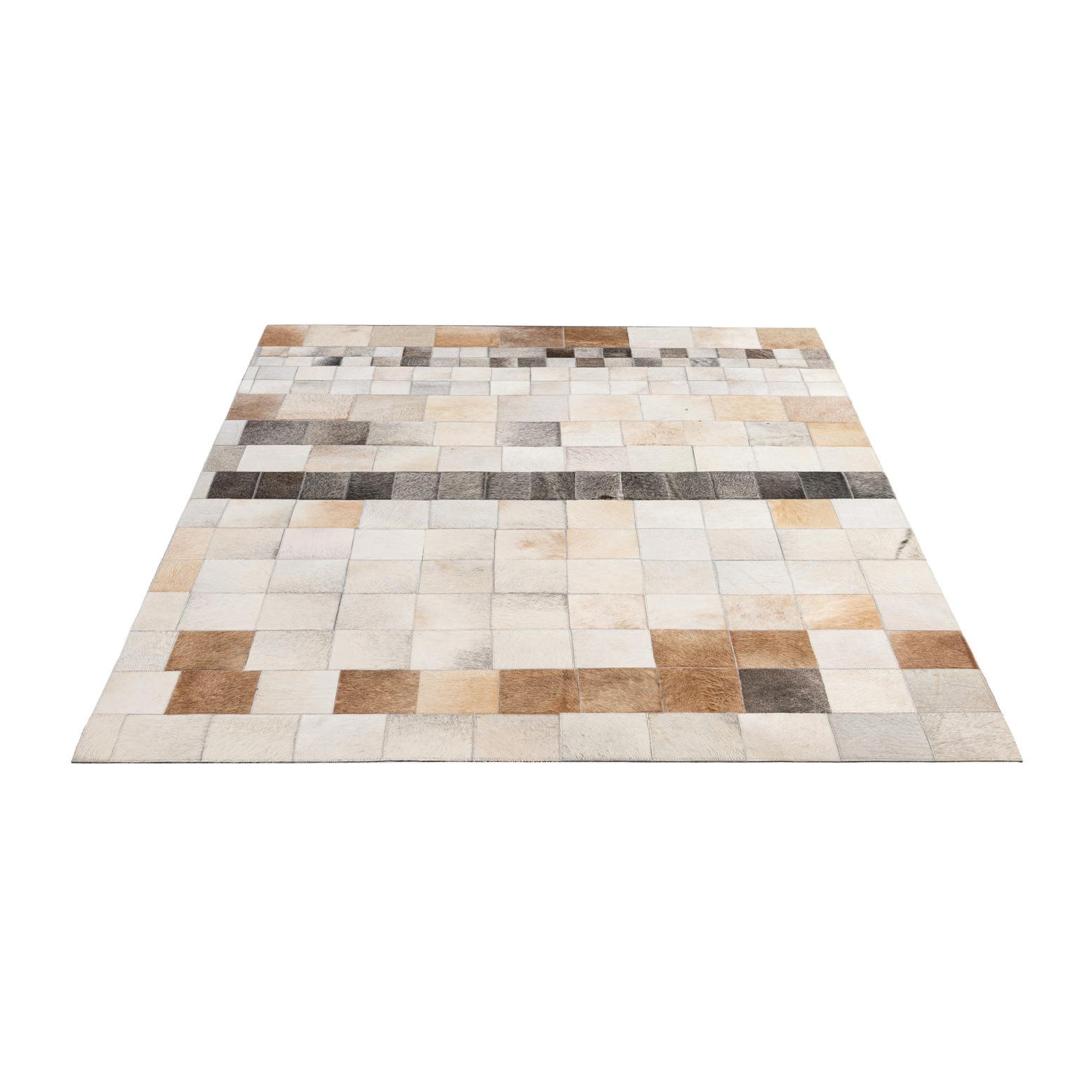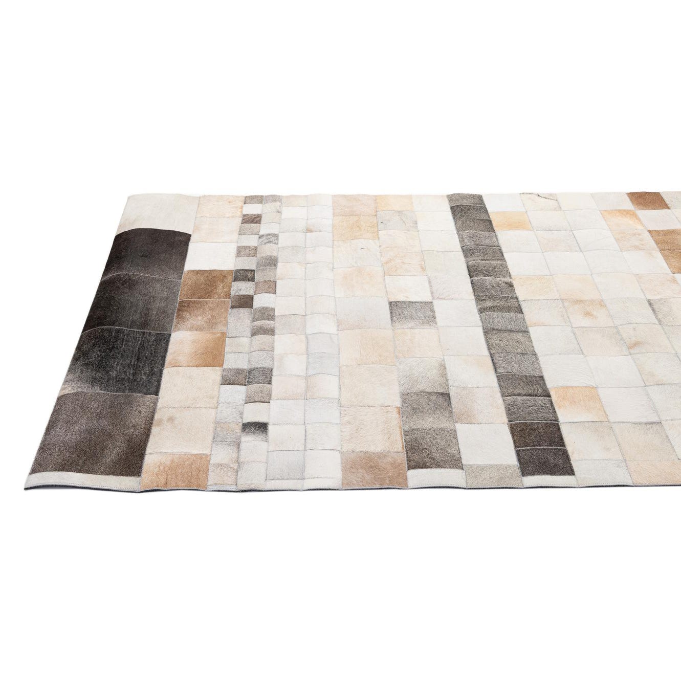 A 5x8 rectangular Cowhide Patchwork rug featuring a modern pattern of multi-colored squares in various natural brown, black, and white tones.