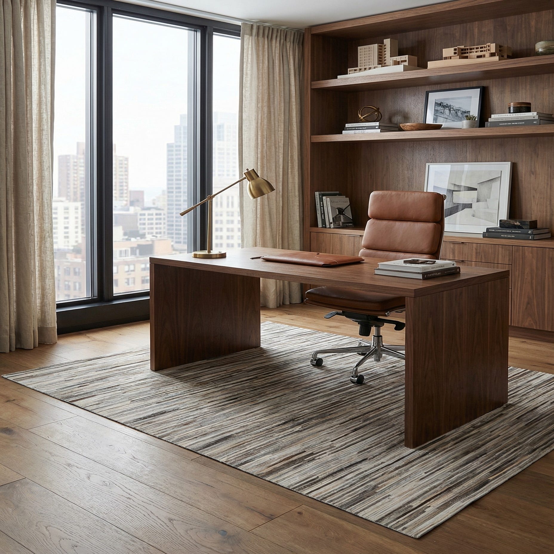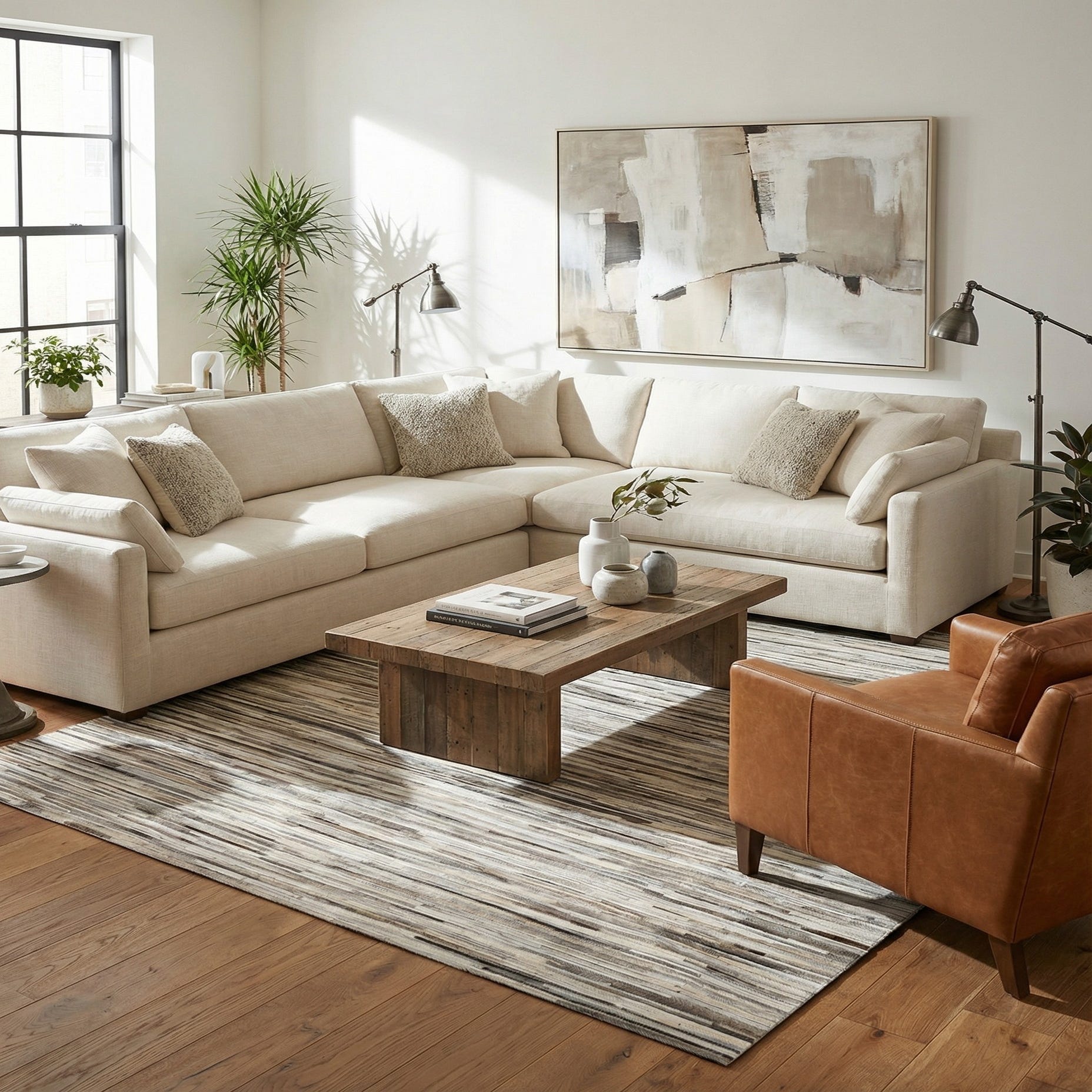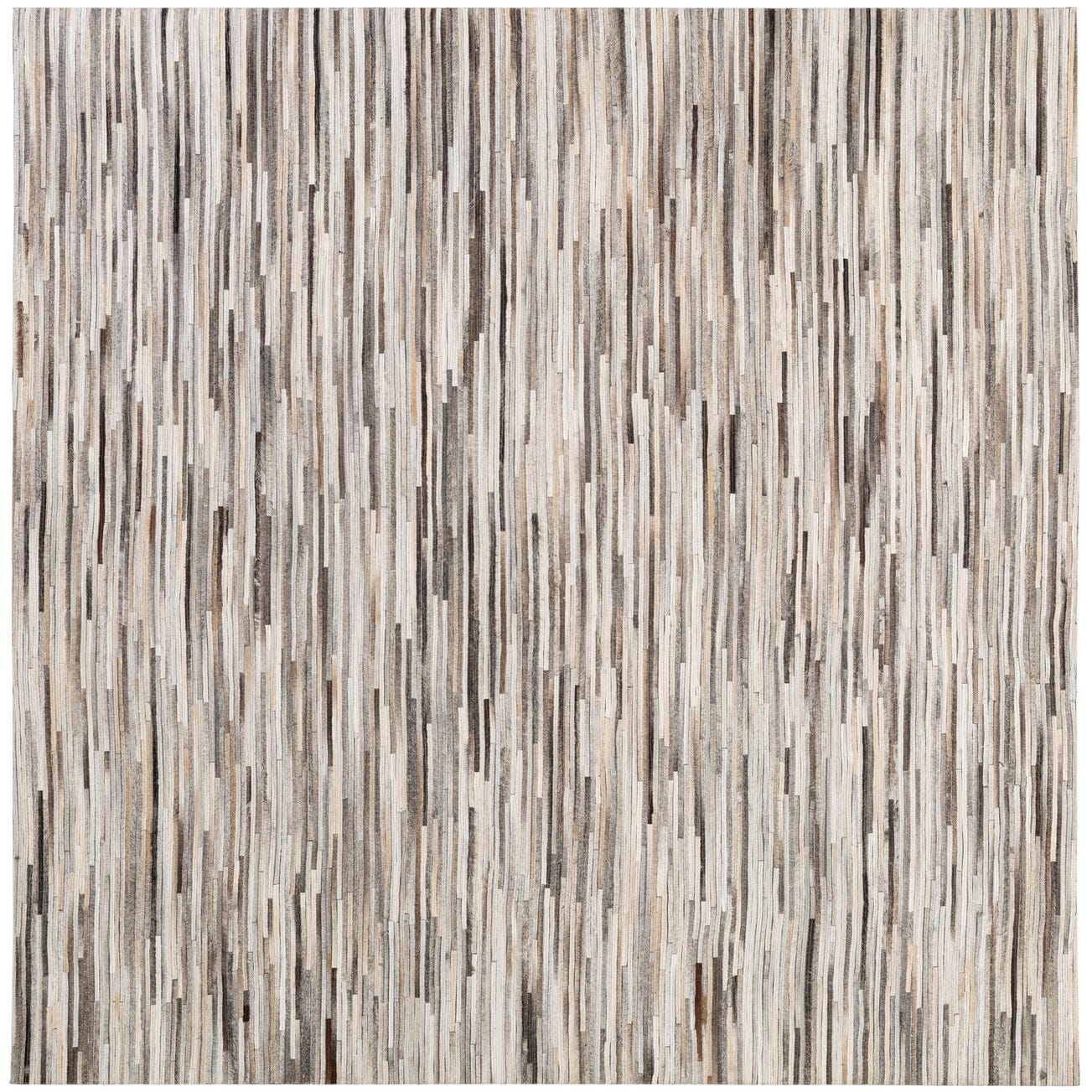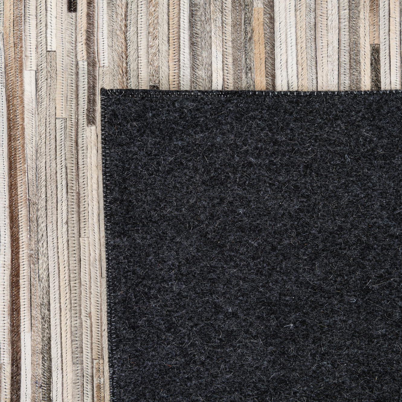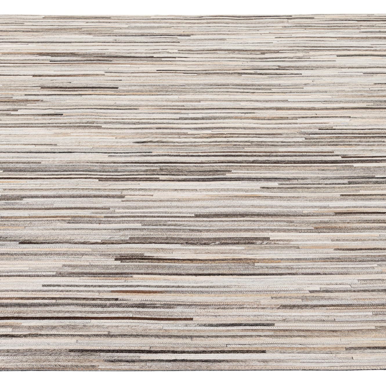 A 5x8 rectangular Cowhide Patchwork rug featuring vertical strips of multi-colored cowhide and leather in shades of white, grey, and brown.