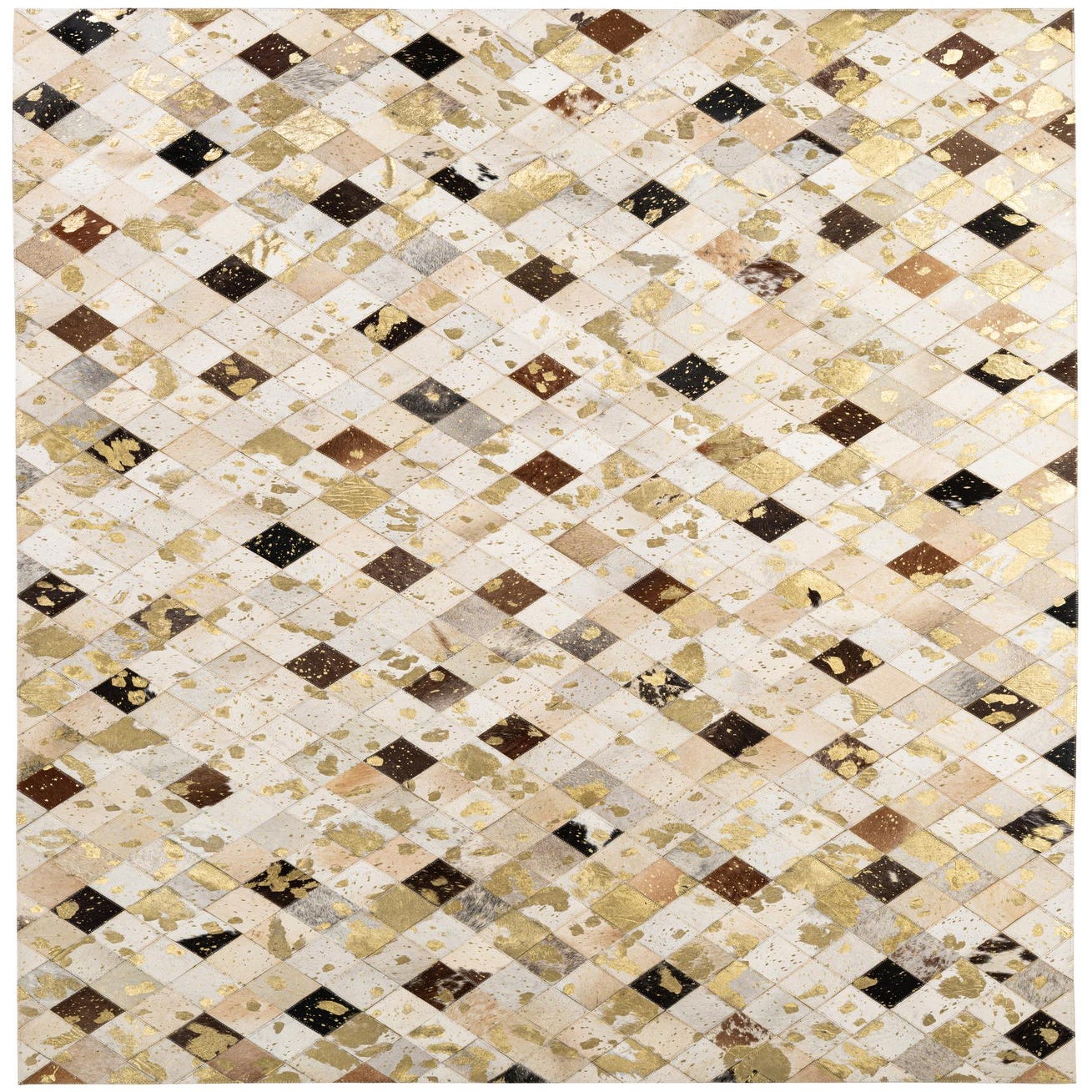 A tight patchwork grid of small diagonal squares creates a clean geometric pattern across the surface, each tile showing natural variation in tone and grain. The background color is multi, with a palette of beige, light brown, ivory and deeper brown punctuated by black accents and warm gold metallic highlights that catch light across the hide. Handmade of cowhide and leather, the rug has a tactile mix of smooth, hair-on-hide surfaces and subtle stitch lines that give gentle texture and depth.