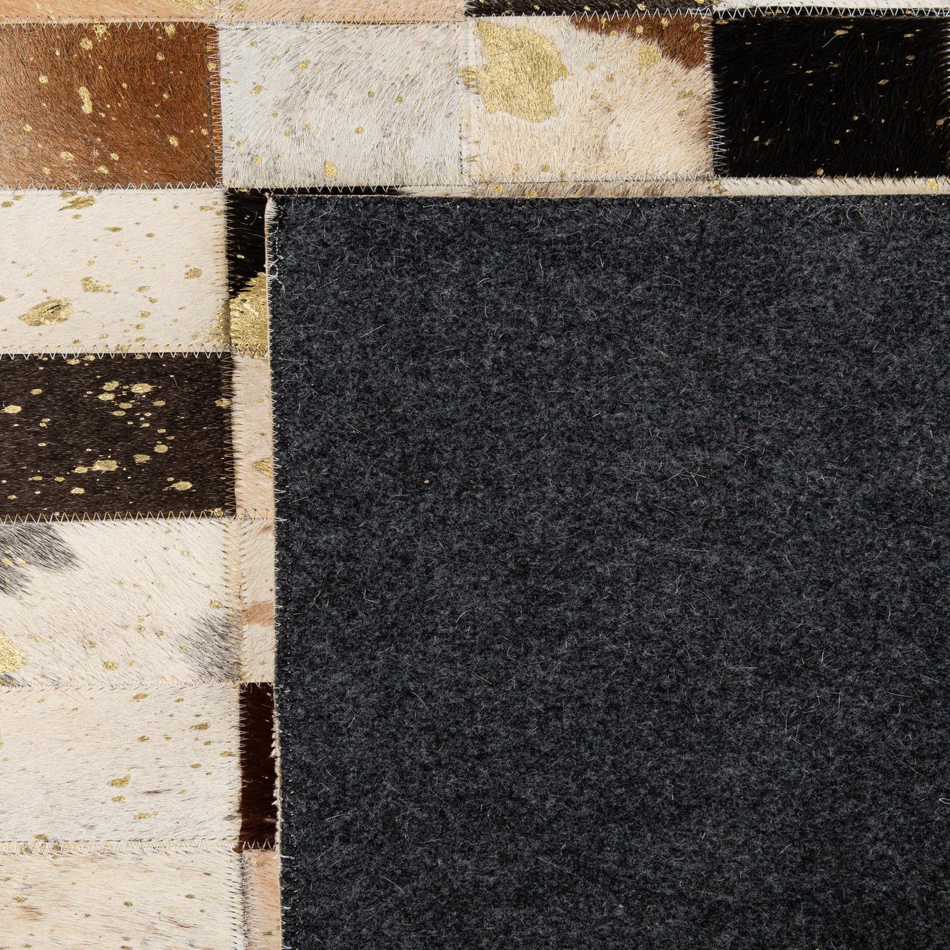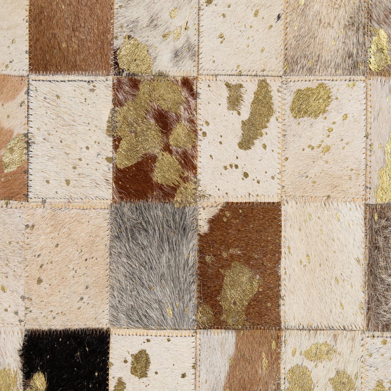 A rectangular 5x8 modern patchwork cowhide rug featuring multi-colored squares with gold metallic accents, ideal for a living room.