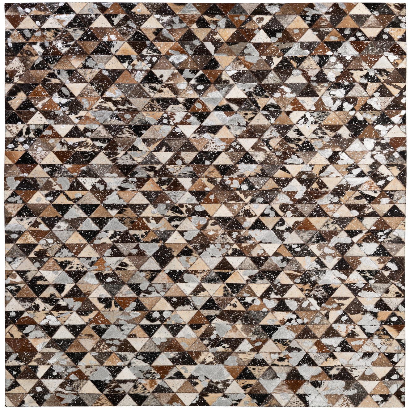 A 5x8 rectangular, multi-colored modern cowhide rug with a patchwork triangular pattern, suitable for a living room.