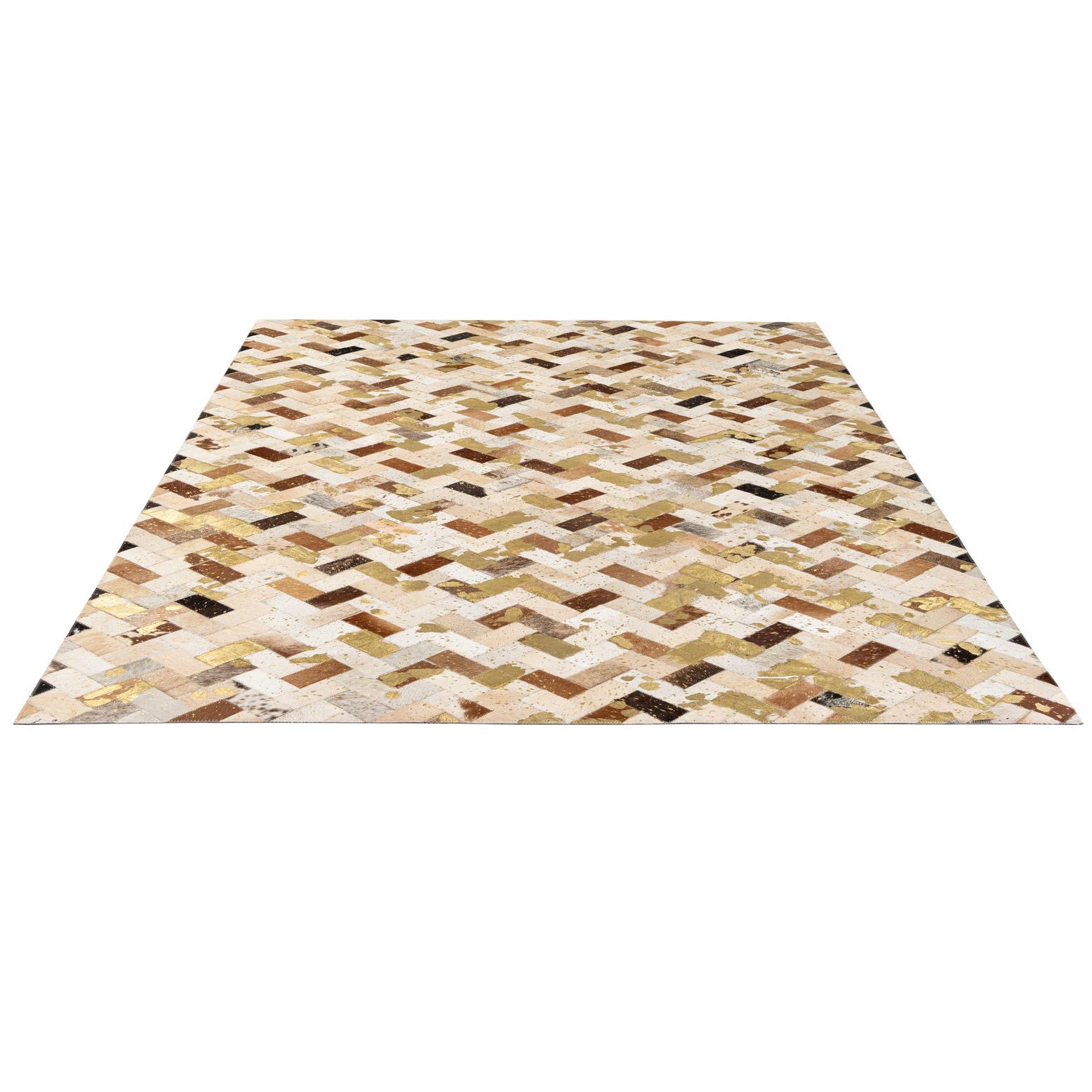 A 5x8 rectangular modern cowhide rug with a multi-colored herringbone pattern, featuring natural browns, creams, and metallic gold accents.