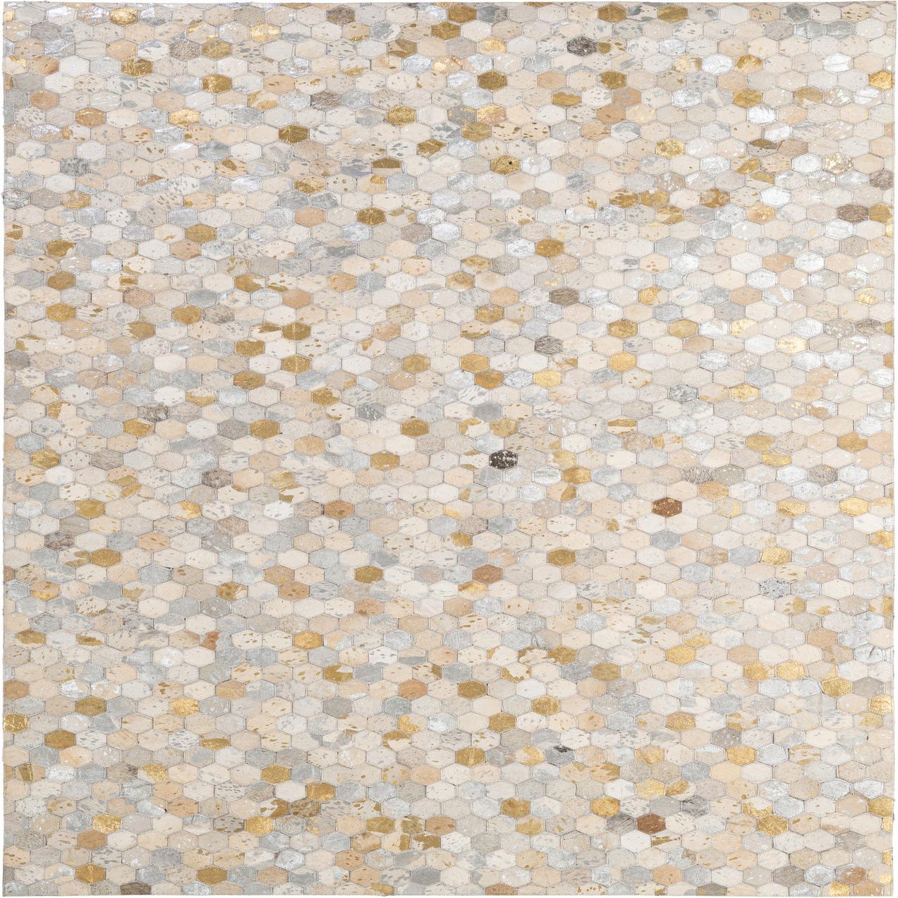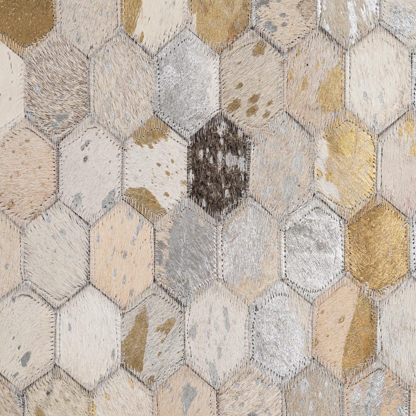 A 5x8 rectangular Cowhide - Patchwork rug featuring a modern honeycomb pattern in multi-colored hues with gold accents.