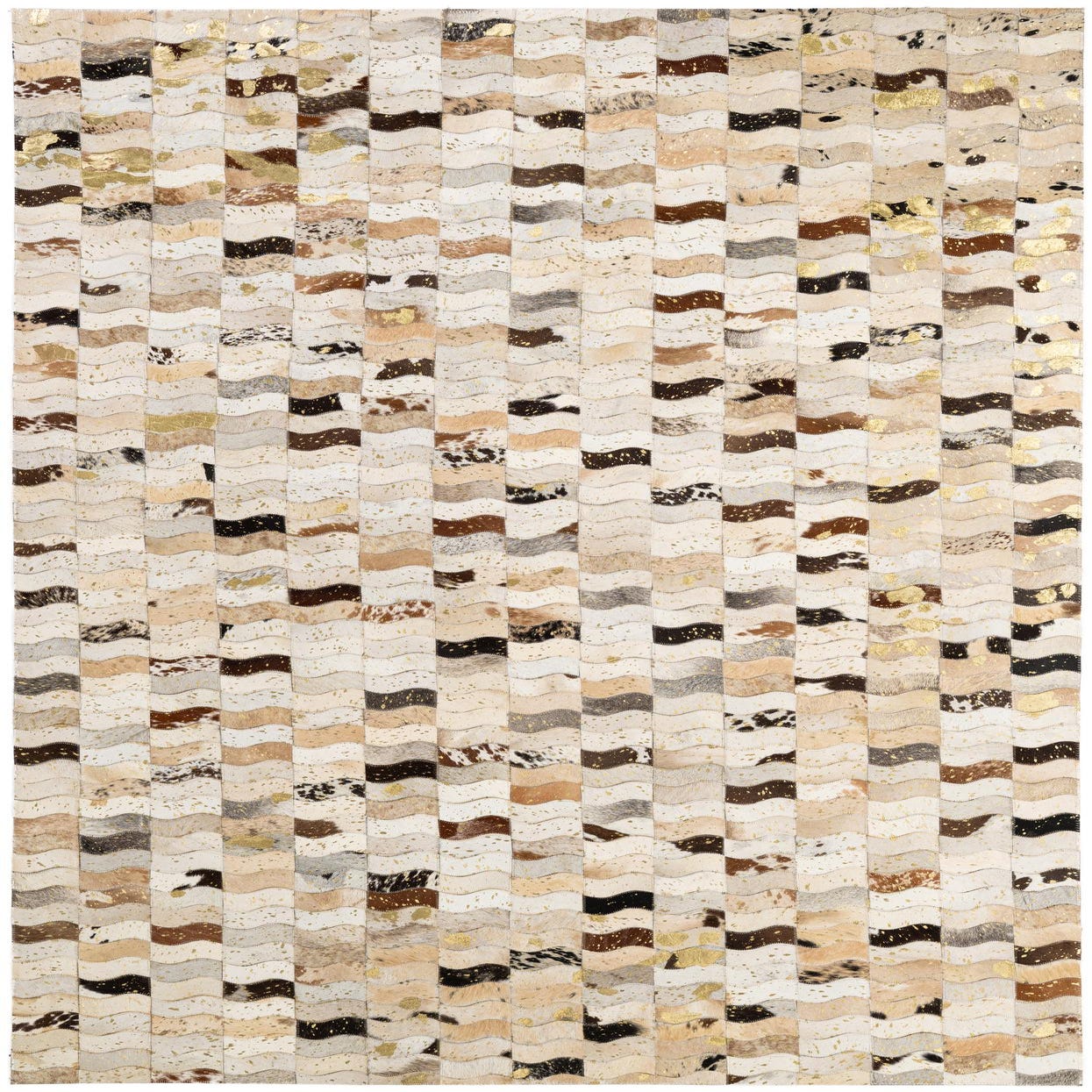 A rectangular 5x8 multi-colored cowhide rug featuring a modern stripe patchwork design with natural hide variations and metallic gold accents.