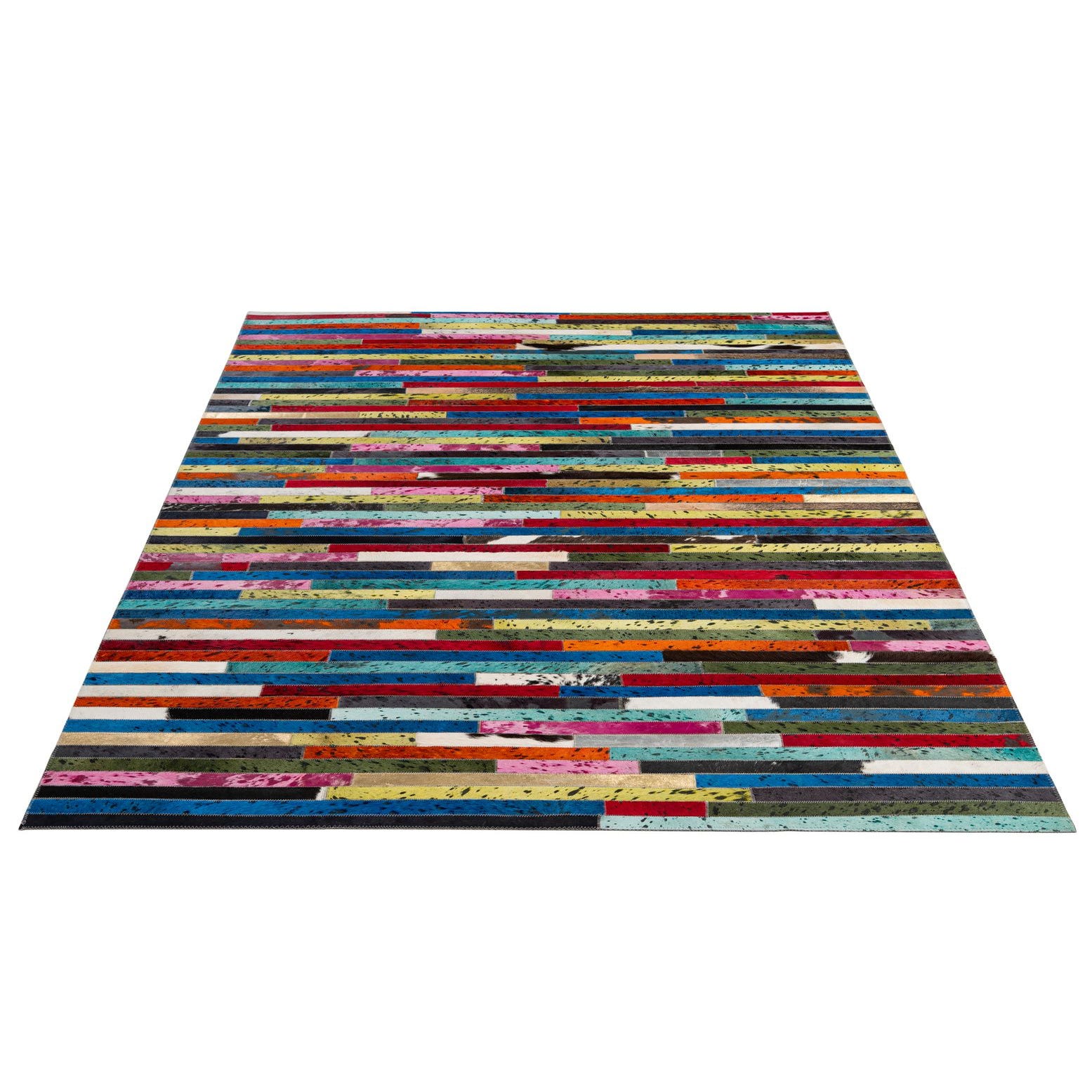 A vibrant 5x8 rectangular Cowhide Patchwork rug featuring horizontal stripes of multi-colored cowhide and leather, ideal for a modern living room.