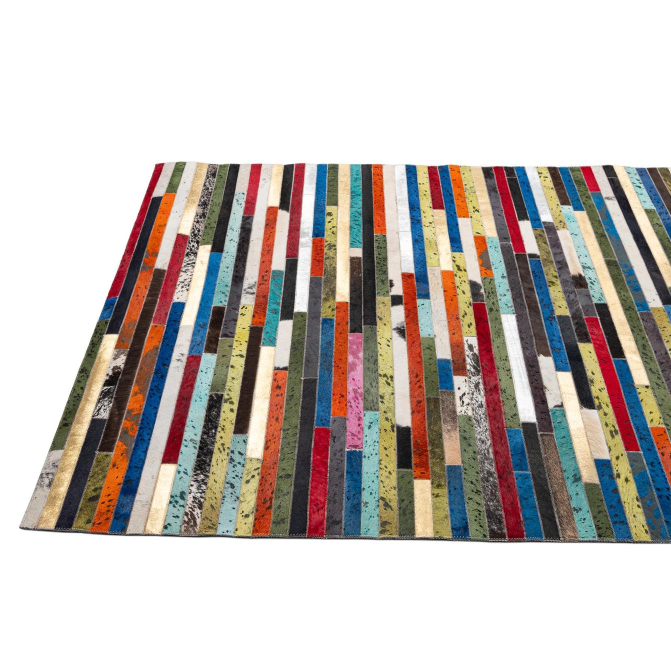 A 5x8 rectangular multi-colored patchwork cowhide rug, featuring horizontal strips of various colors and textures, suitable for a modern living room.