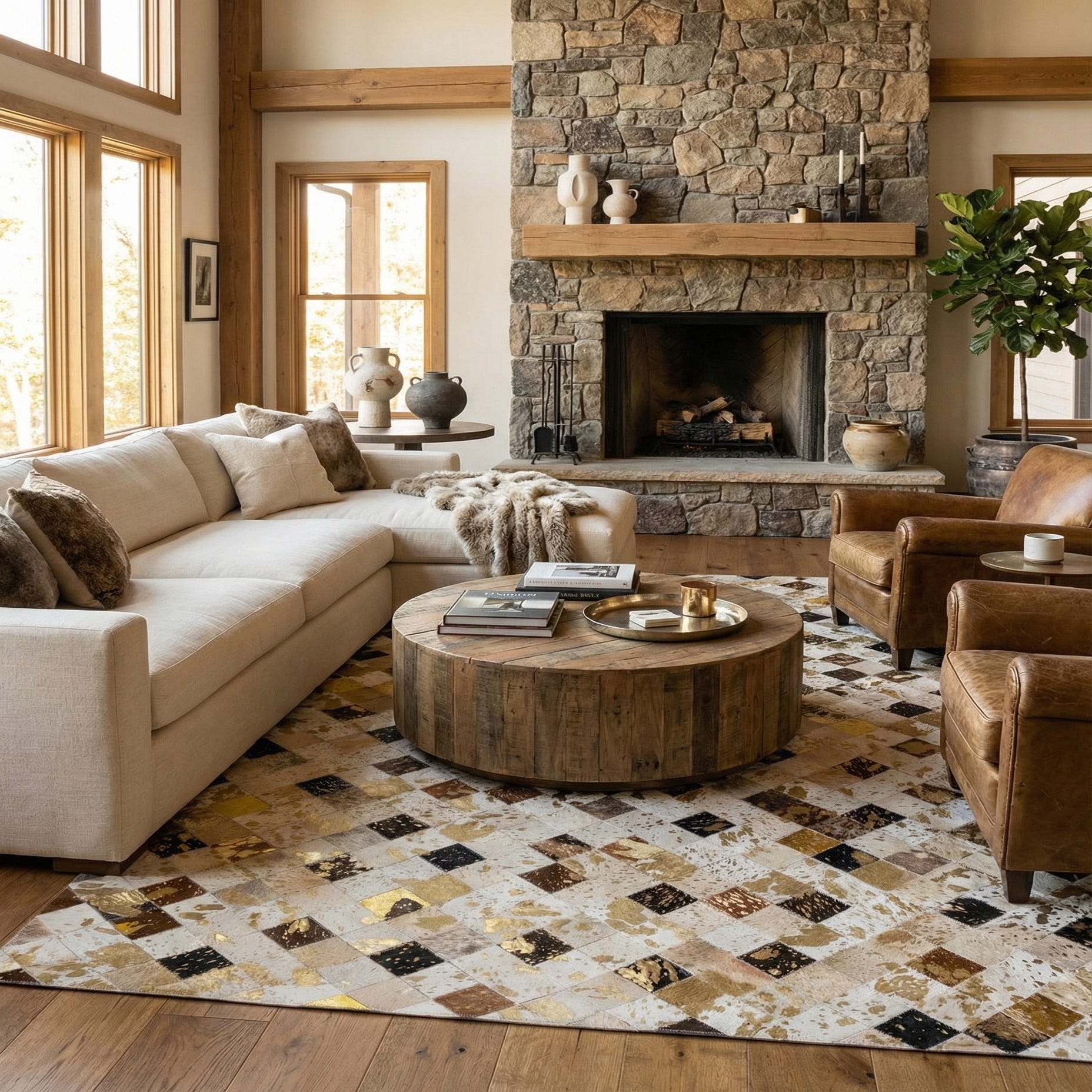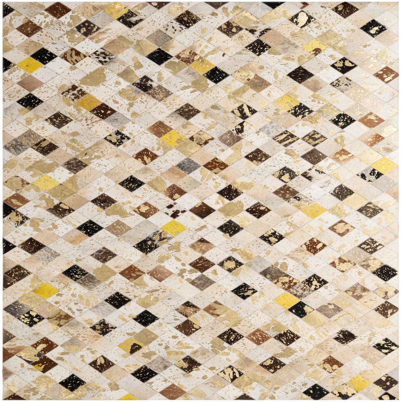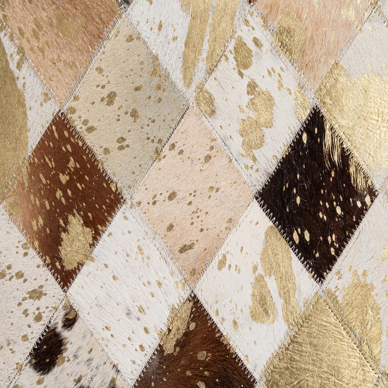 A patchwork of small diamond tiles creates a quietly detailed field of natural variation and metallic highlights. Each square is hand cut and stitched from hair-on cowhide and leather, presenting a mix of ivory, beige, brown and black tones with pops of yellow and warm gold leaf. The pattern alternates solid and speckled hides, so the surface reads as lively but orderly—soft hair texture sits next to smooth, slightly glossy leather, and subtle seams add a handcrafted, tactile quality underfoot. The overall background reads multi-tonal, with the gold and yellow accents catching light for gentle contrast.