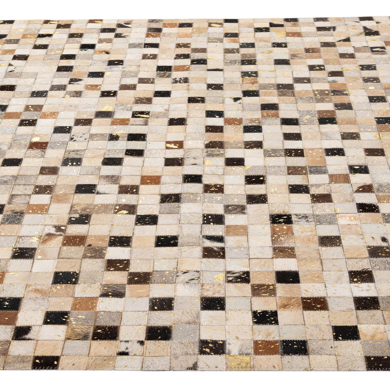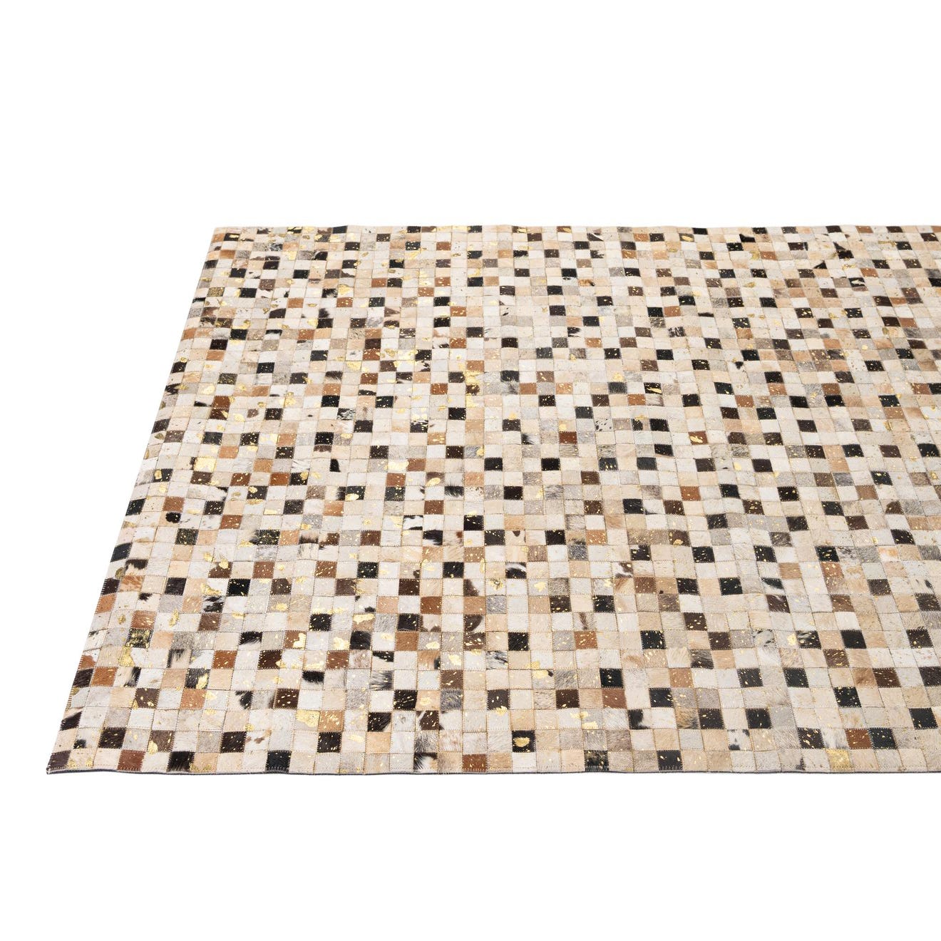 A rectangular 5x8 modern patchwork cowhide rug with multi-colored squares in shades of brown, black, white, and gold.