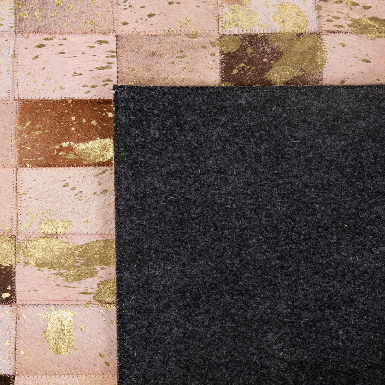 A rectangular 5x8 modern patchwork cowhide rug featuring multi-colored squares with metallic gold accents.