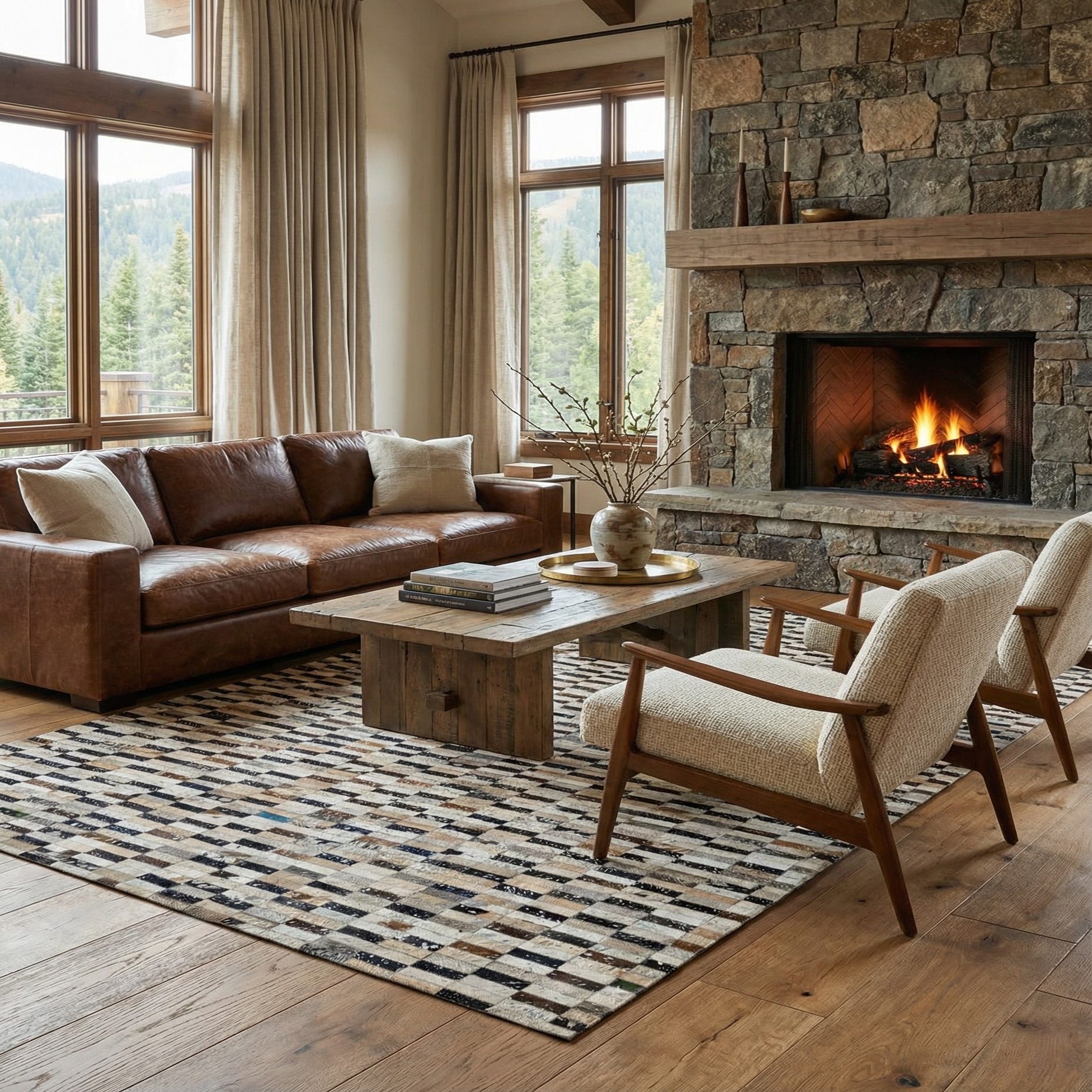 A rectangular 5x8 multi-colored cowhide patchwork rug with a modern stripe pattern, ideal for a living room.