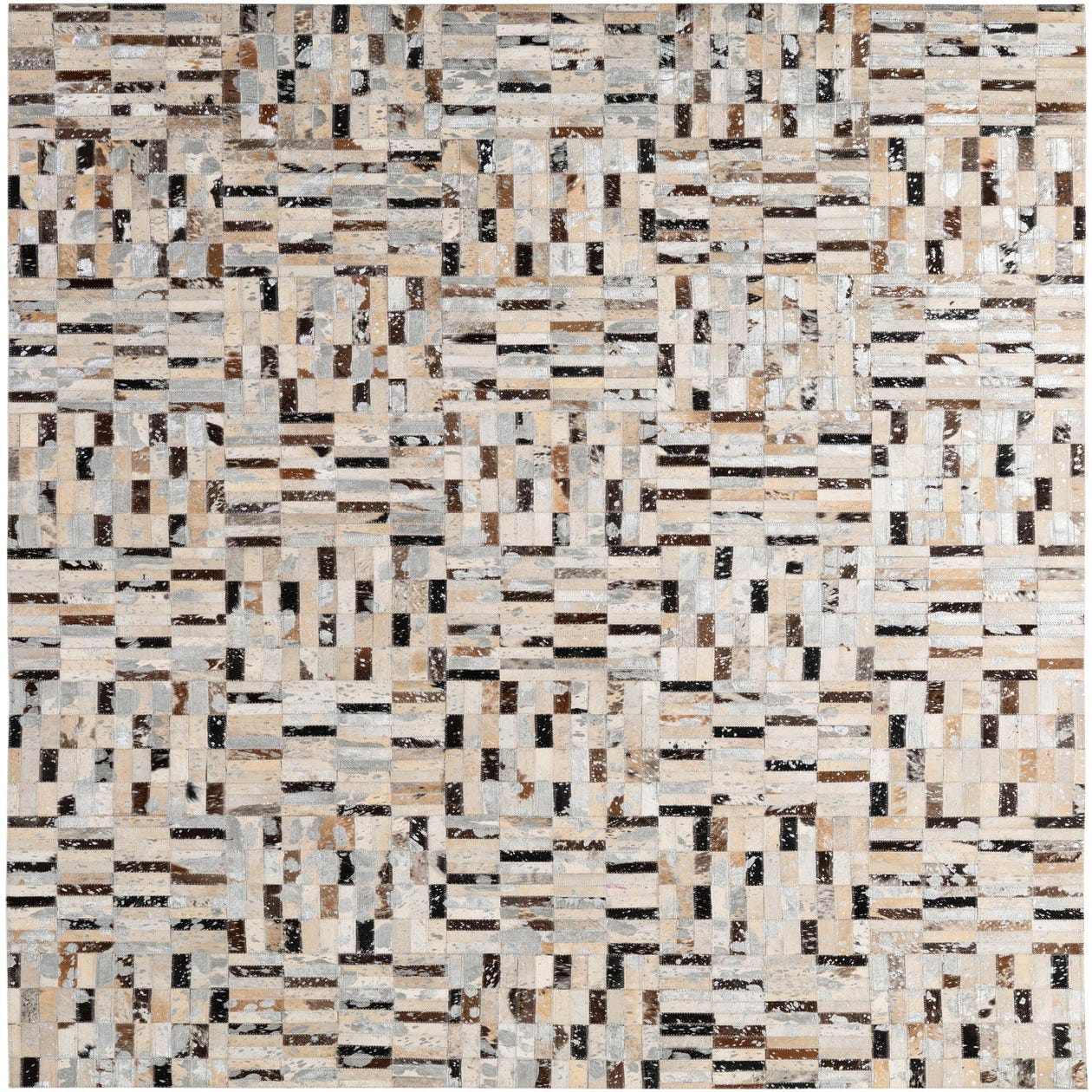 A rectangular 5x8 modern patchwork cowhide rug with multi-colored rectangular pieces in varying shades of brown, black, white, and grey.