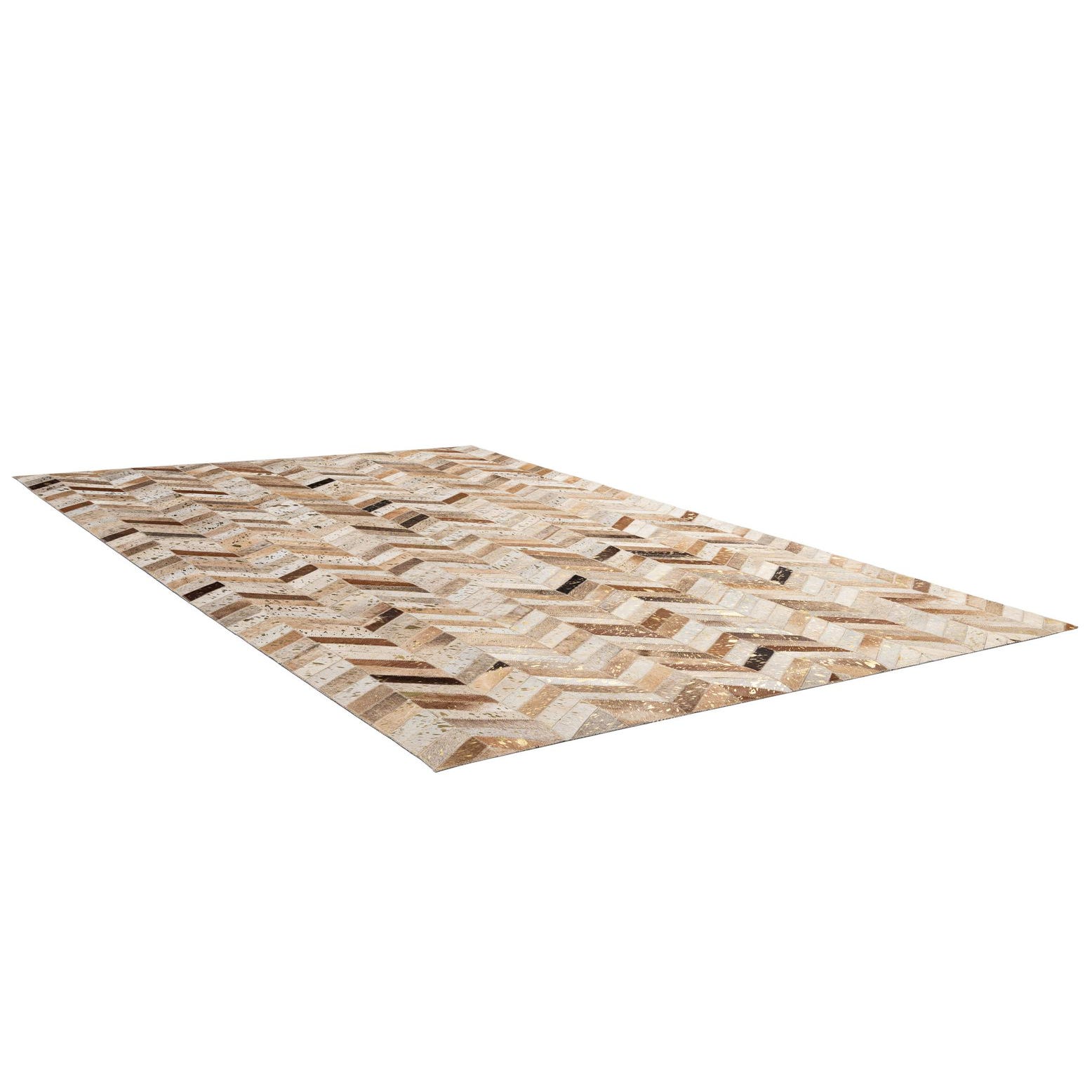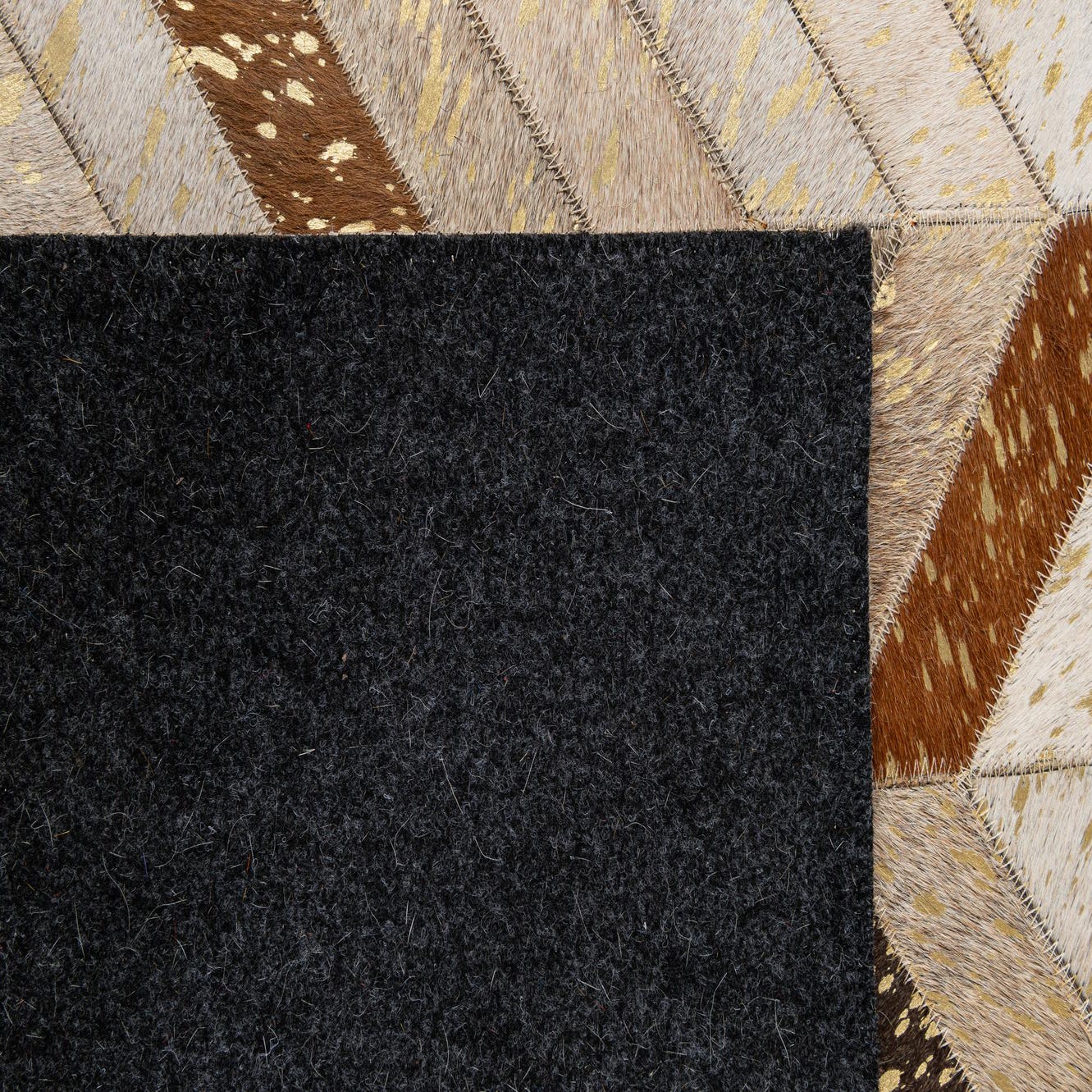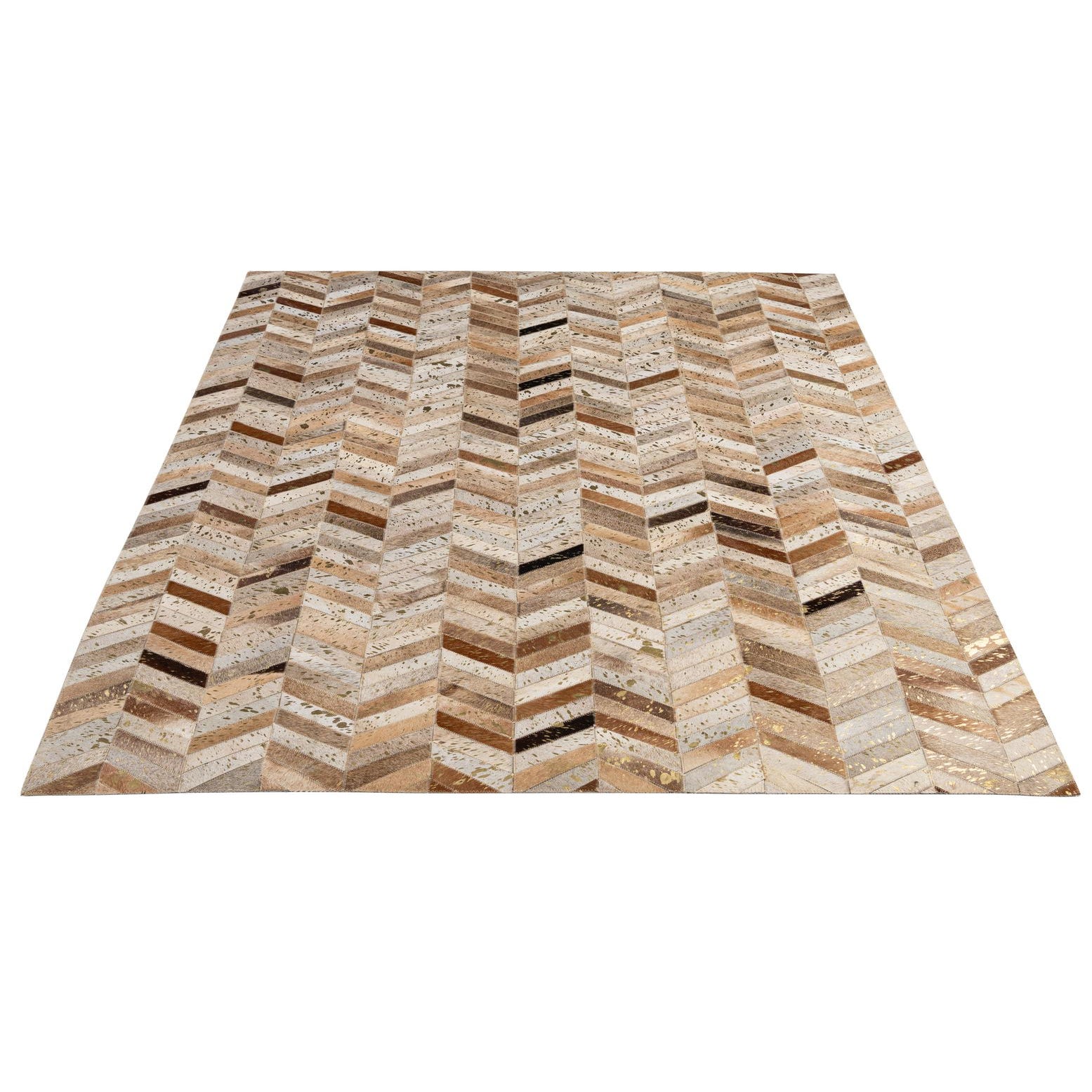 A 5x8 rectangular Cowhide - Patchwork rug with a modern multi-colored chevron pattern, featuring natural browns, creams, and black with gold speckles.