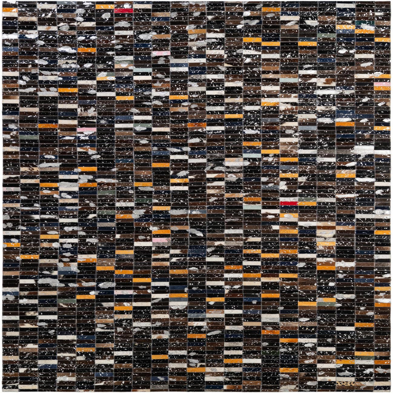 A 5x8 rectangular Cowhide Patchwork rug featuring a modern multi-colored design with black, white, brown, and orange rectangular patches, ideal for a living room.
