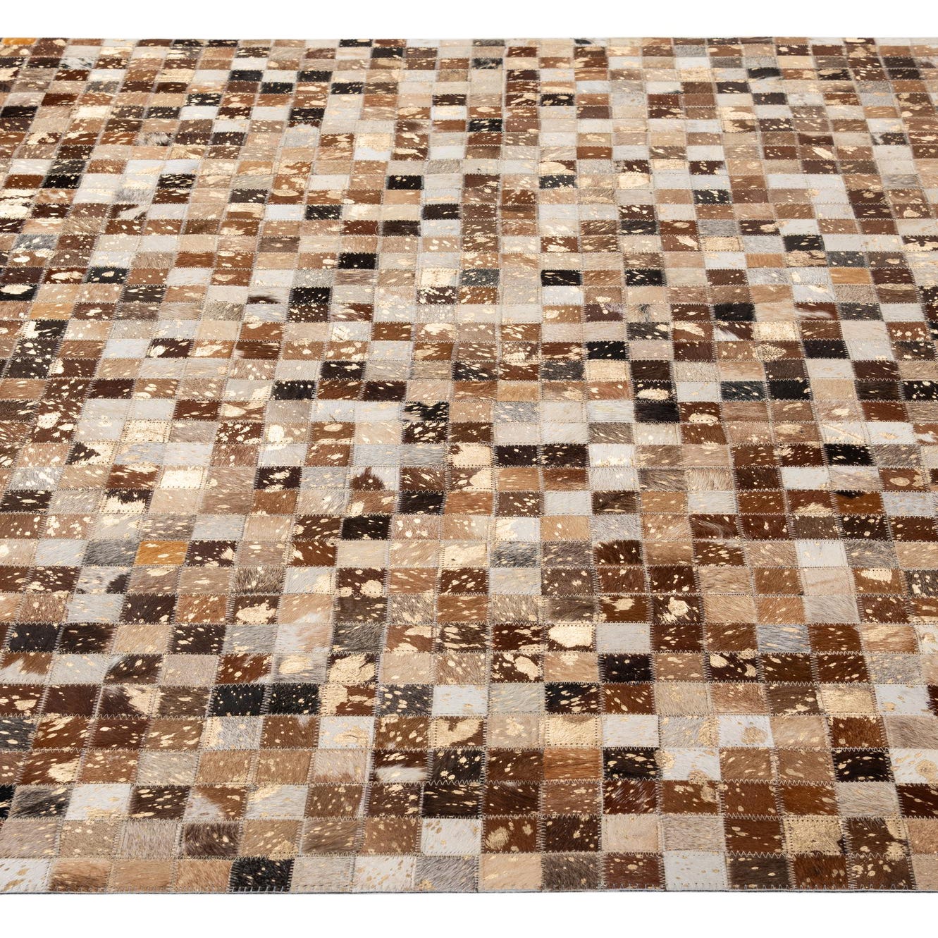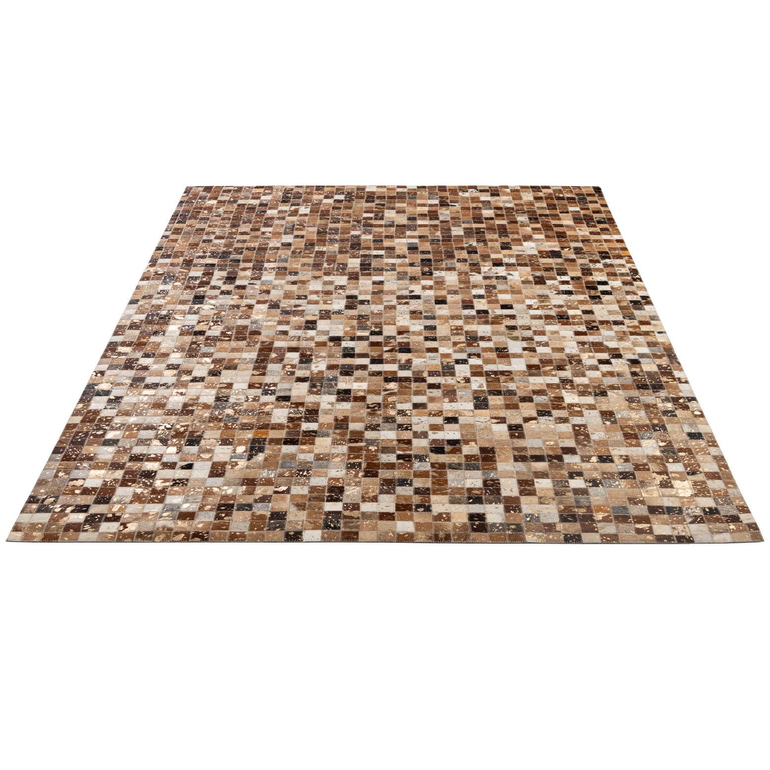 A 5x8 rectangular Cowhide Patchwork rug featuring a modern multi-colored mosaic of natural brown, black, white, and gold-flecked squares.