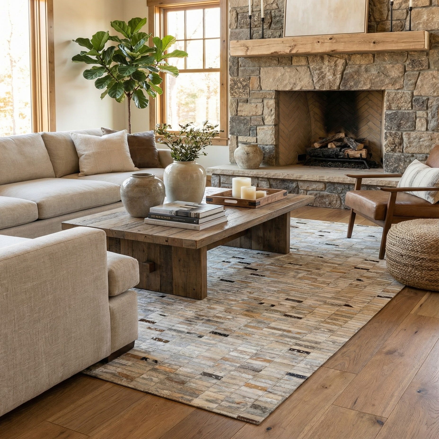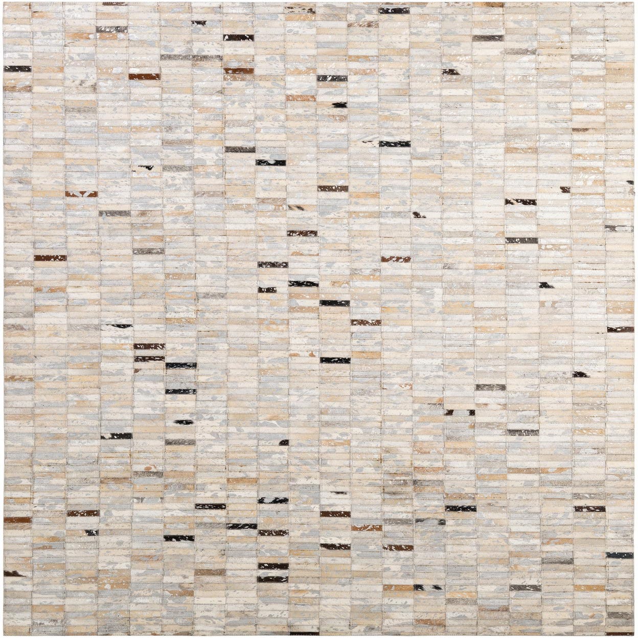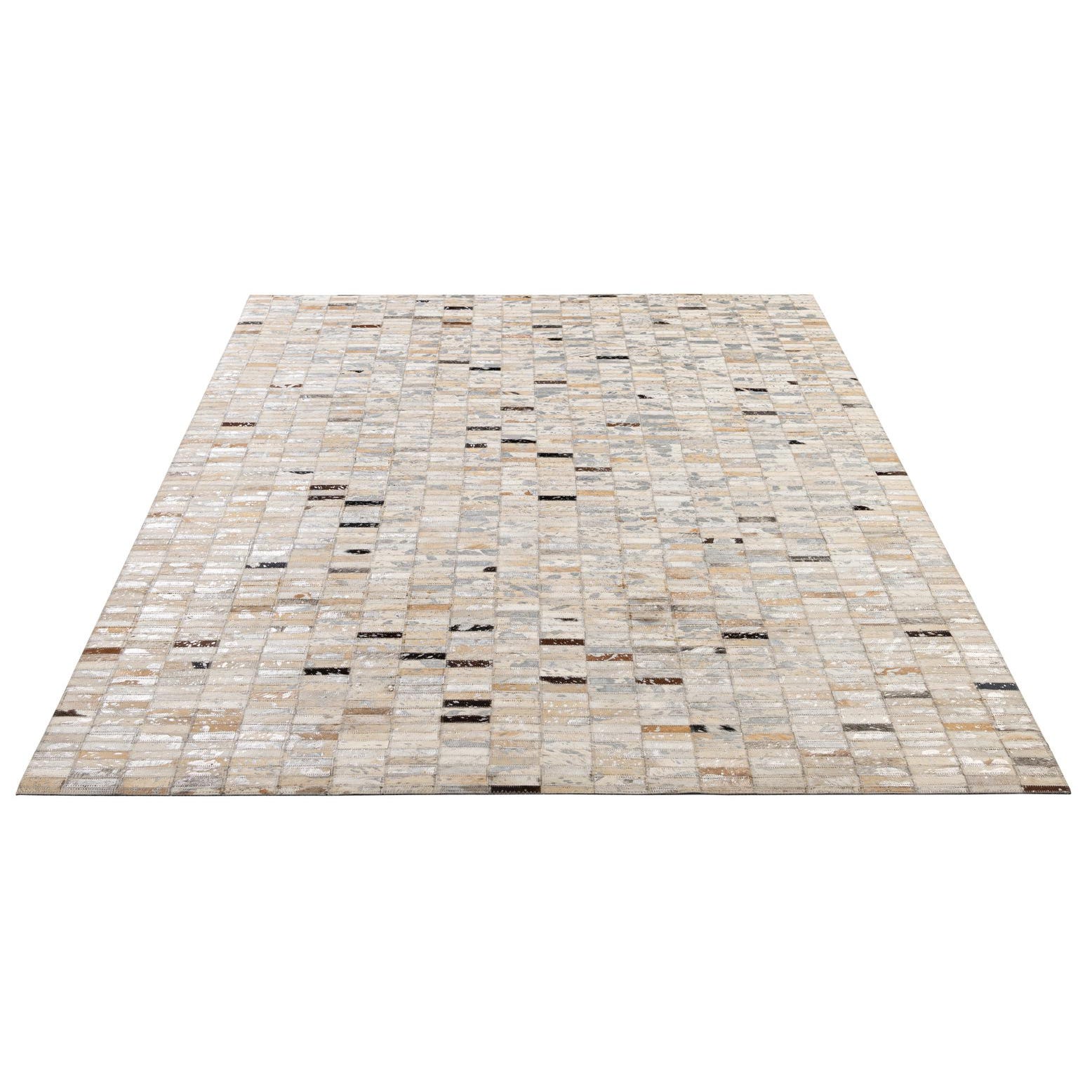A rectangular 5x8 modern patchwork cowhide rug with multi-colored squares in shades of cream, beige, brown, and grey.