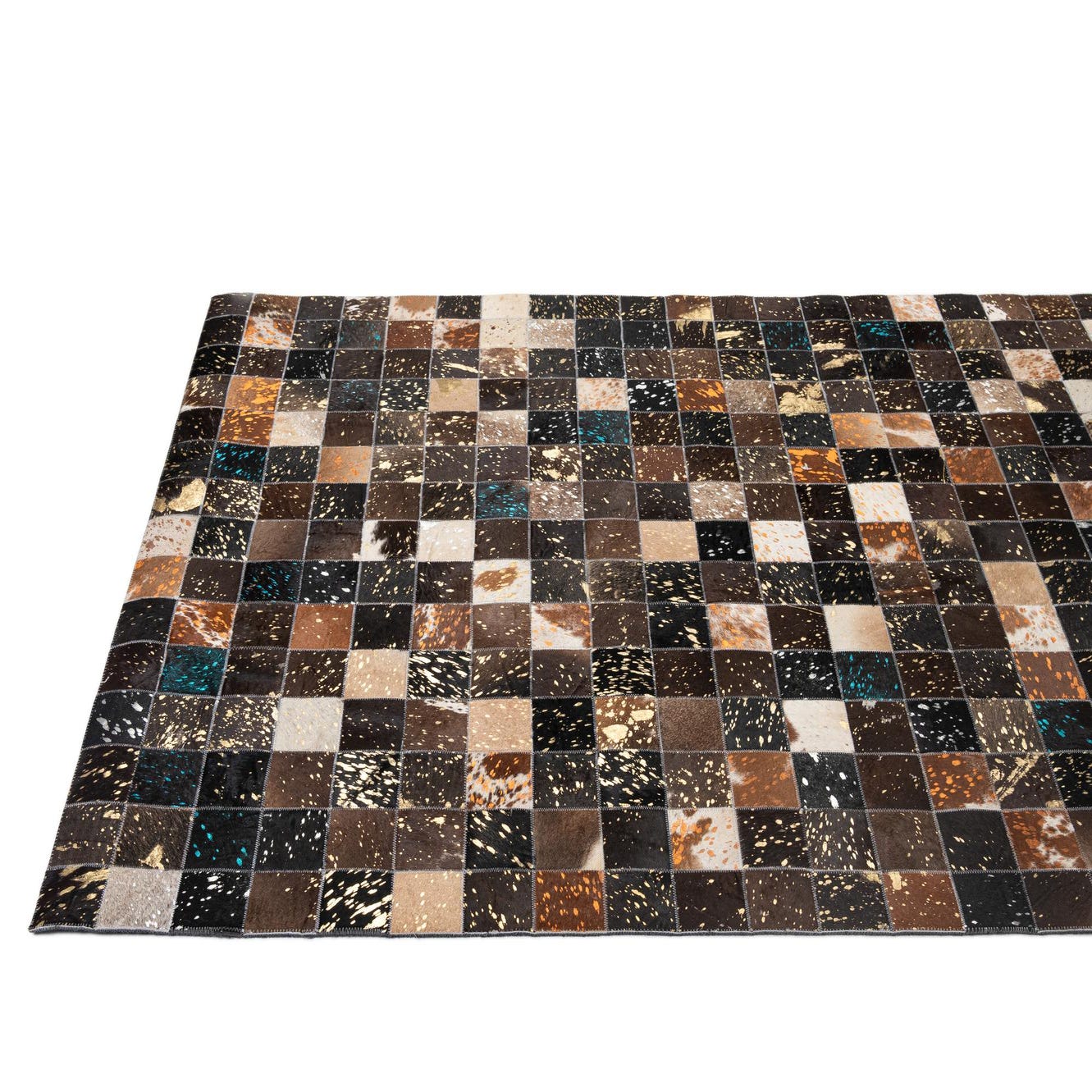 A 5x8 rectangular multi-colored cowhide patchwork rug with a modern design, featuring squares of black, brown, white, and tan, some with metallic gold, silver, orange, or teal paint splatters.