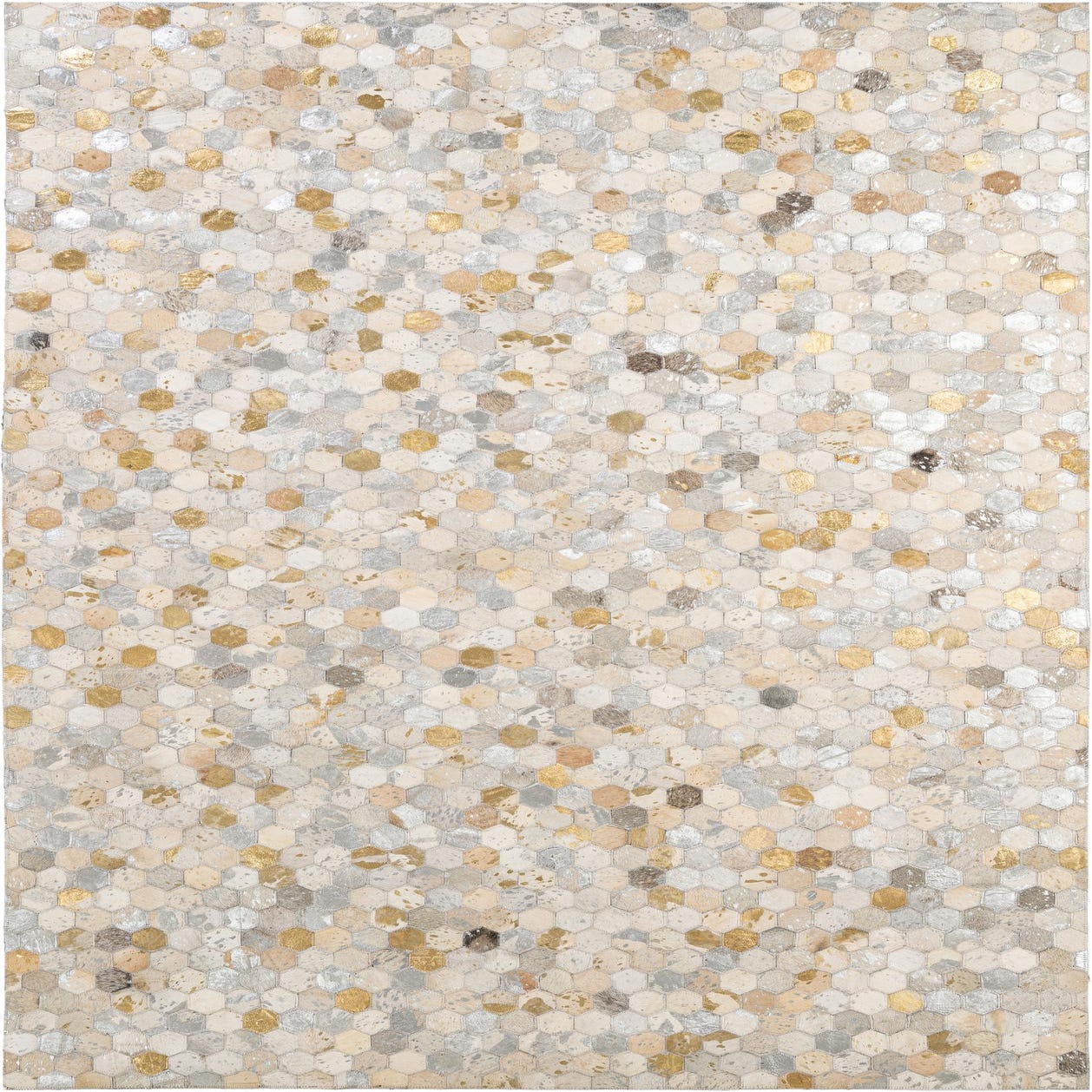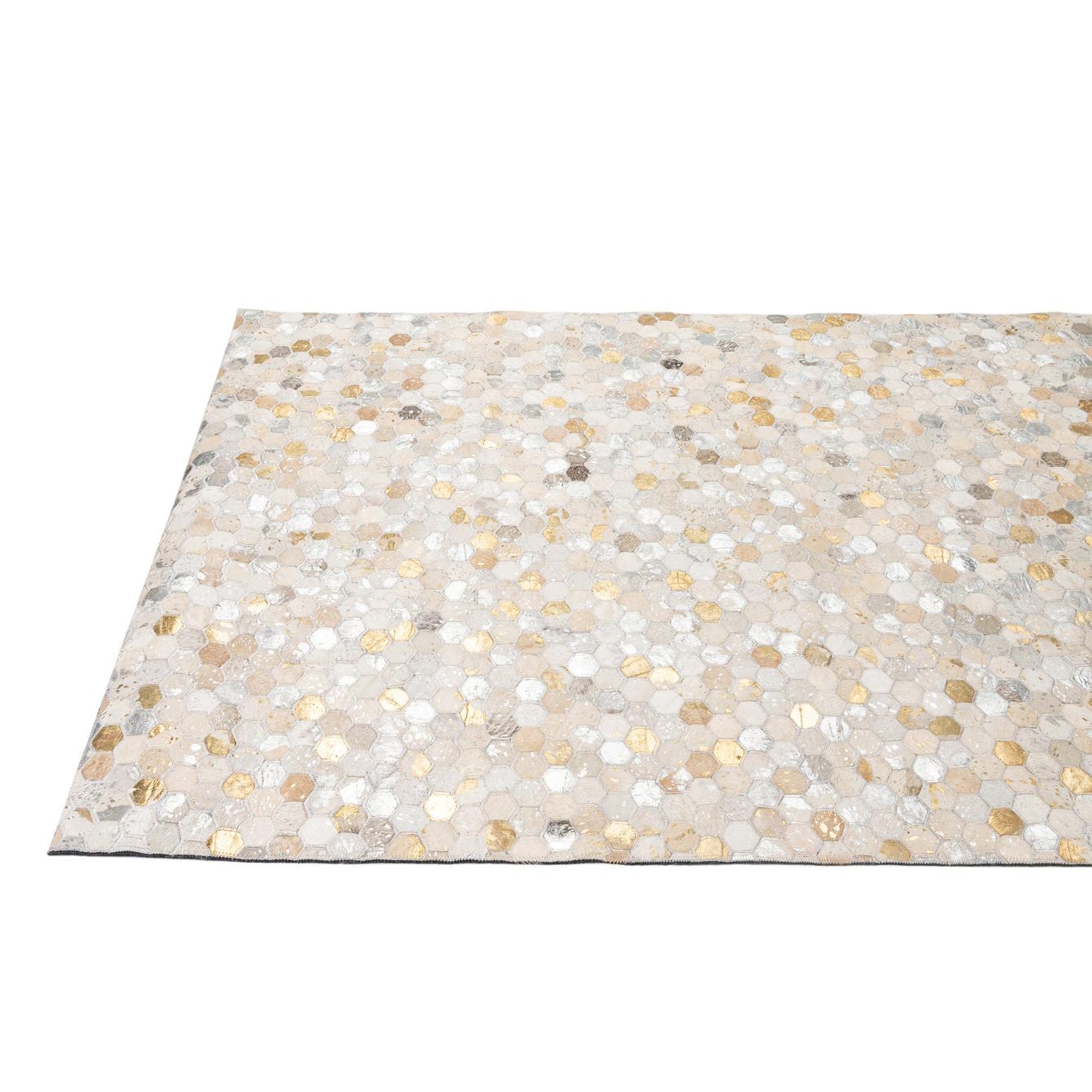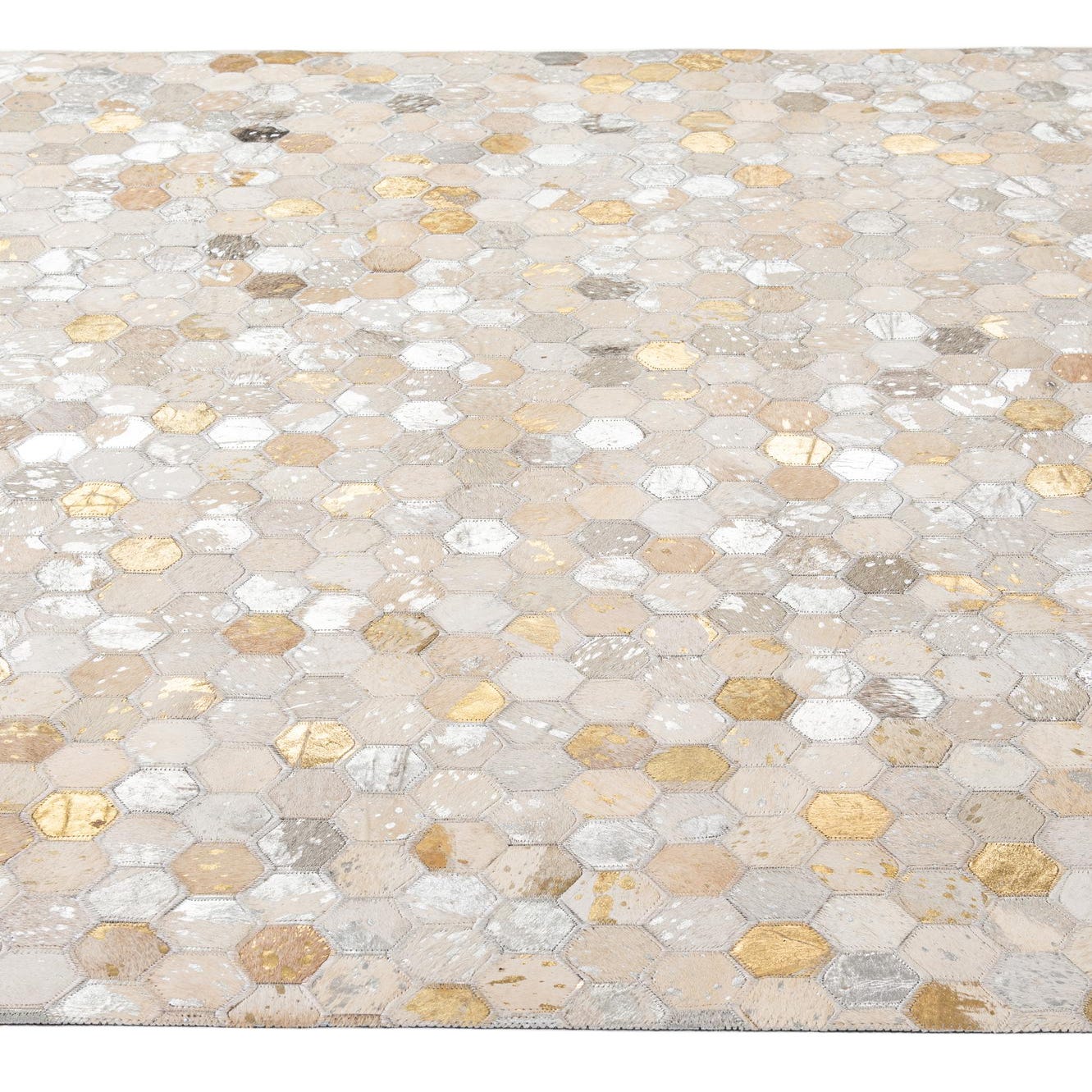 A 5x8 rectangular Cowhide Patchwork rug with a modern hexagonal pattern in multi-colored natural and metallic gold tones.