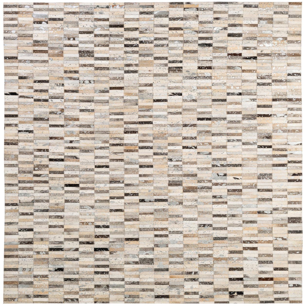 A 5x8 rectangular Cowhide Patchwork rug featuring a modern stripe pattern in multi-colored natural tones.