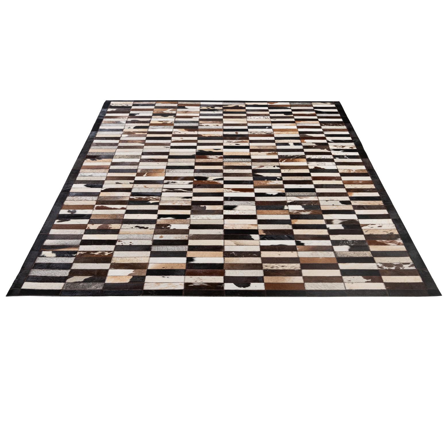 A 5x8 rectangular Cowhide Patchwork rug featuring a modern stripe pattern in multi-colored natural cowhide and leather.