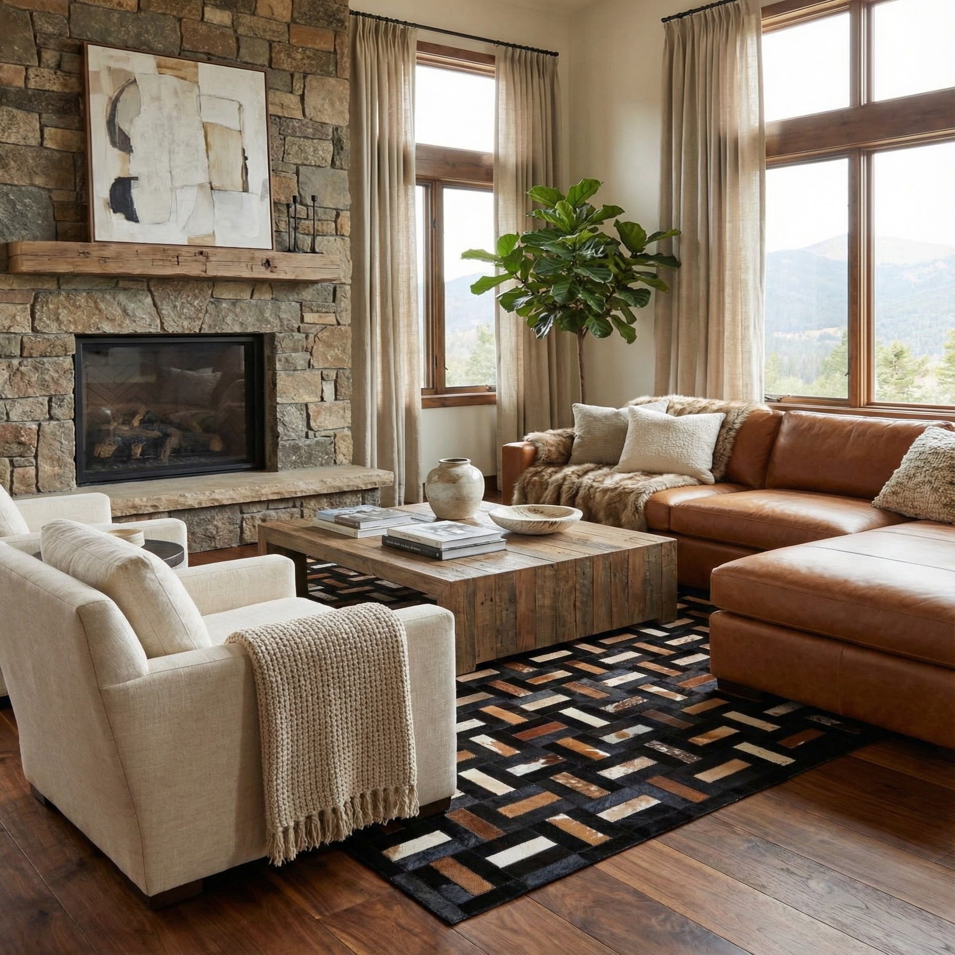 The surface invites touch: hair-on-hide textures and subtle variations in nap and grain are apparent where each patch is stitched, and the leather edges provide a smooth, low-profile finish with a soft sheen. This rug fits well in modern-rustic or transitional rooms—layer it under a low-profile sofa in a living room with warm wood tones, place it beneath a dining table to complement leather seating, or use it in a study to add depth and tactile interest. Its warm neutrals and bold contrast also make it an effective anchor in monochrome or industrial-inspired interiors.