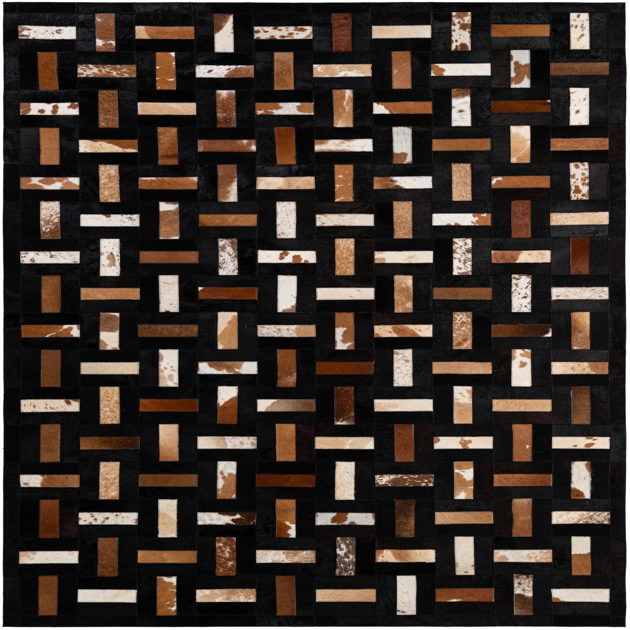 Hand made of cowhide & leather, this patchwork rug arranges short rectangular hides into a woven, basket-like grid for a structured yet organic pattern. The multi background frames a mix of beige, ivory, brown and black patches—some solid, some with natural speckling—so the design combines clean geometry with the individual character of each hide. The repeating rectangles create a rhythmic visual that reads contemporary with rustic undertones.