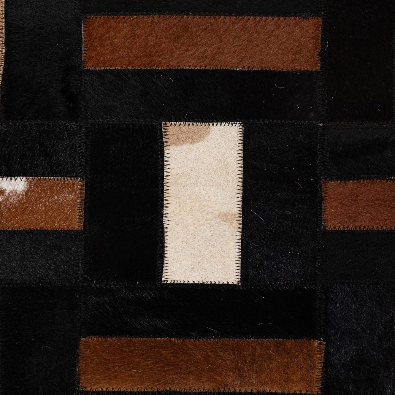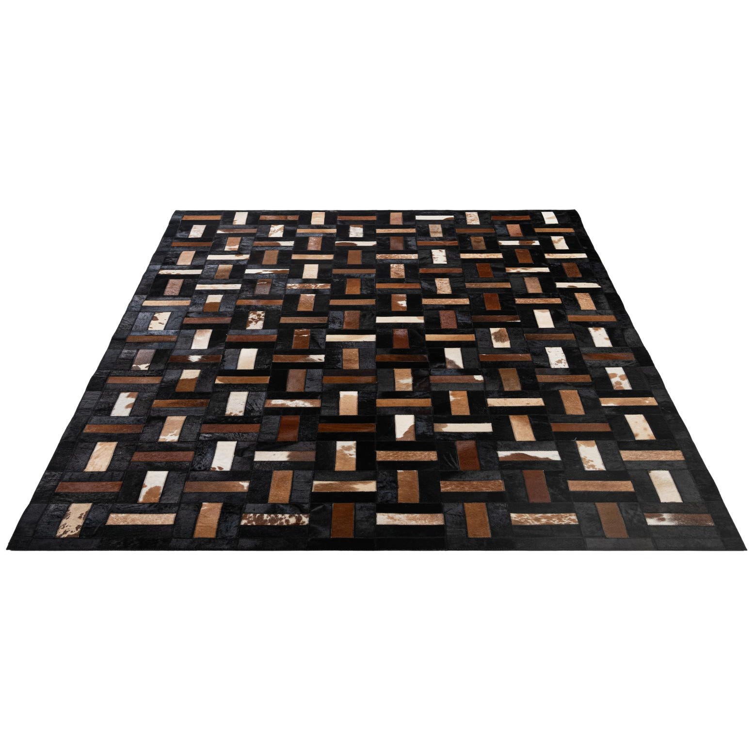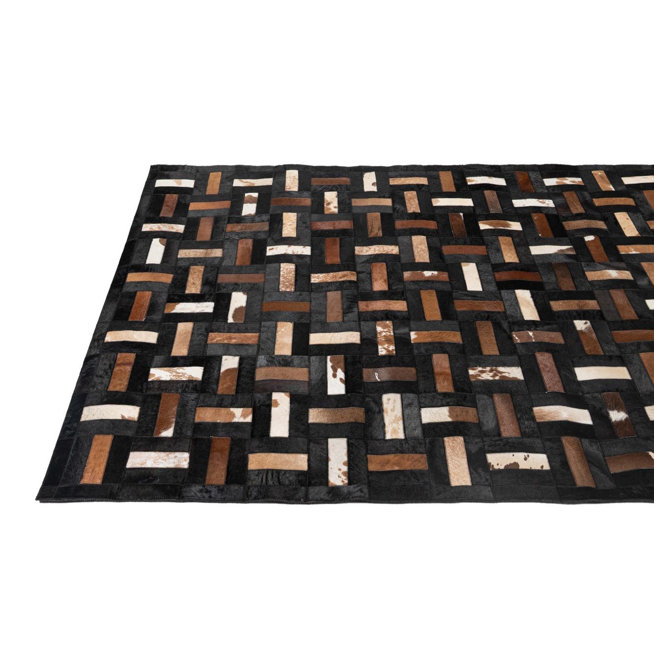 A 5x8 rectangular Cowhide Patchwork rug featuring a modern geometric pattern of multi-colored brown, white, and black leather rectangles.