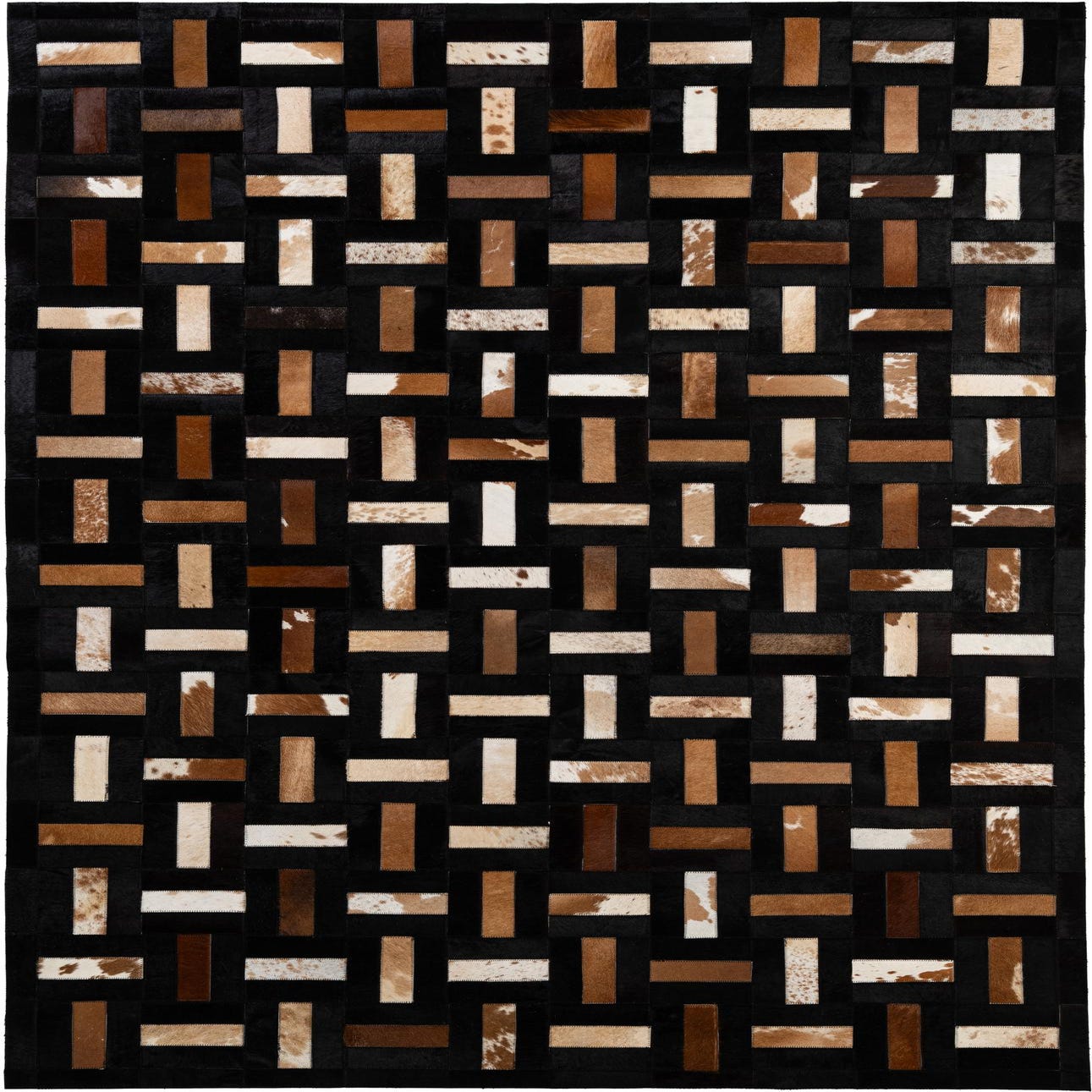A 5x8 rectangular Cowhide Patchwork rug with a modern stripe pattern in multi-colored brown, black, and white tones.