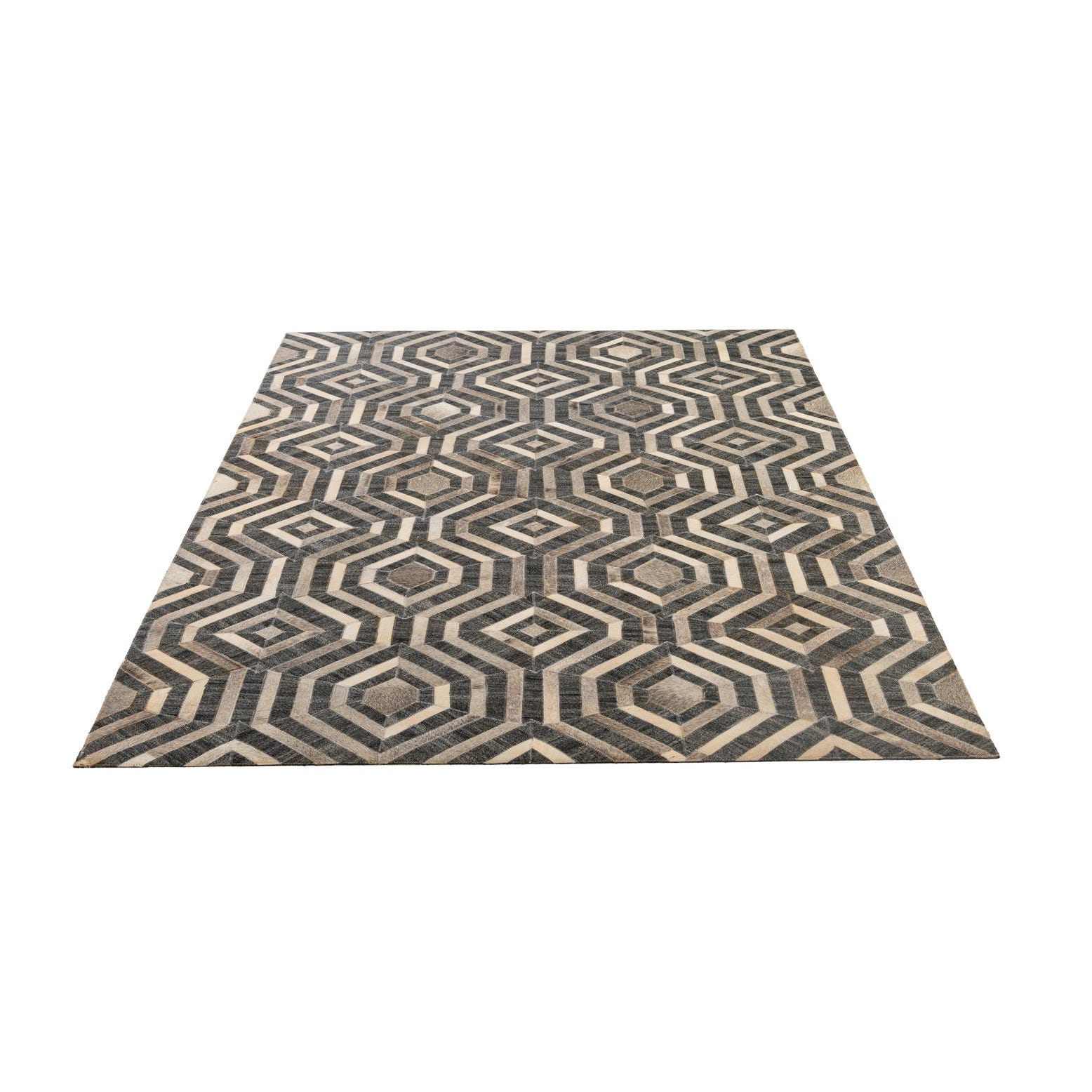 A 5x8 rectangular Cowhide Patchwork rug featuring a modern geometric pattern in multi-colored shades of gray, black, and cream.