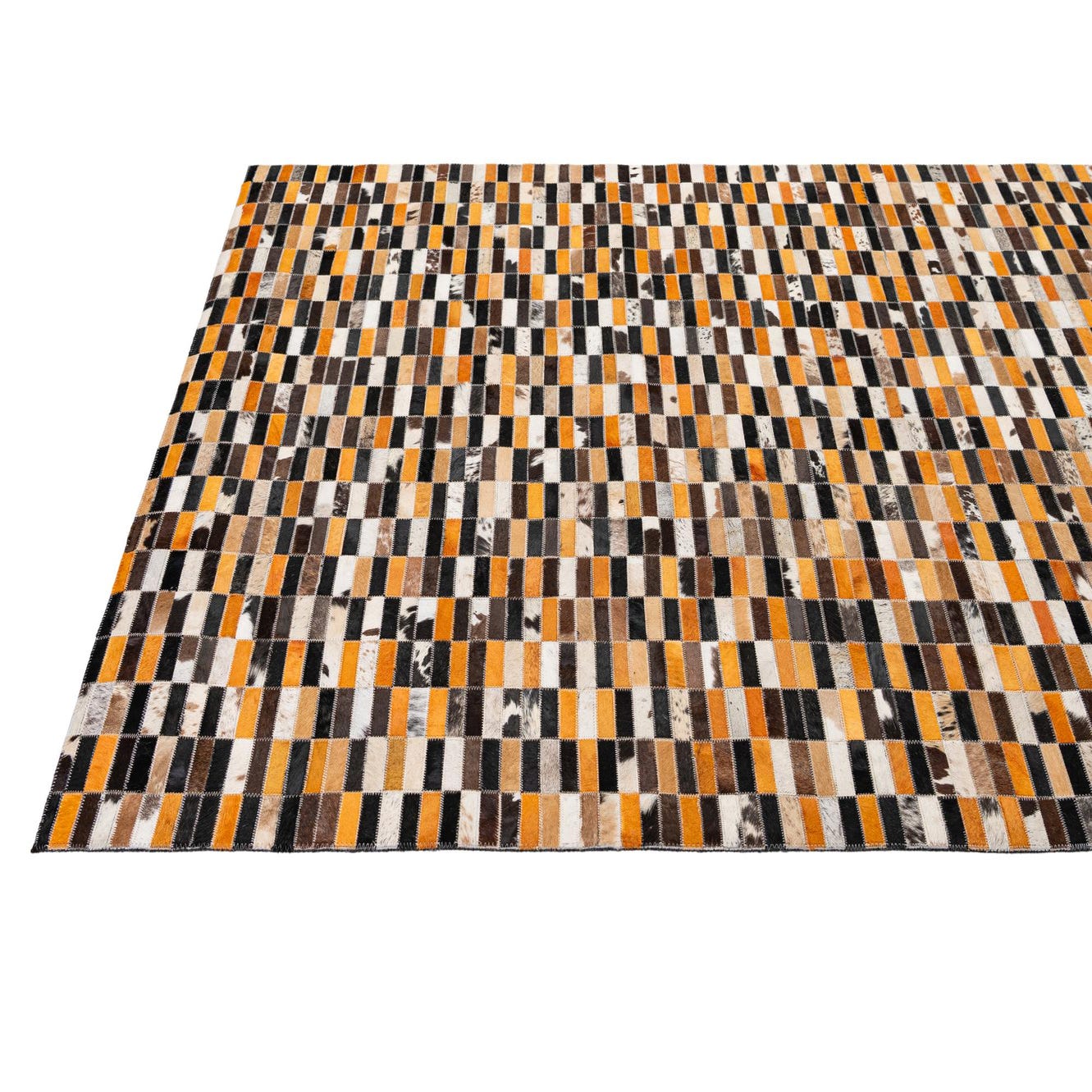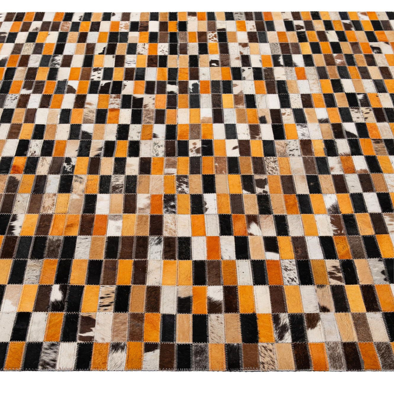 Handmade from cowhide and leather, this patchwork rug arranges narrow rectangular pieces into a tightly scored, brick-like grid. The hair-on-hide surface offers a soft, slightly textured feel underfoot, with visible stitch lines where each patch meets that add subtle dimension. A multi-tonal background weaves together shades of brown, light brown and ivory with pops of light salmon, yellow and orange, and natural hide markings introduce organic variation across the composition.