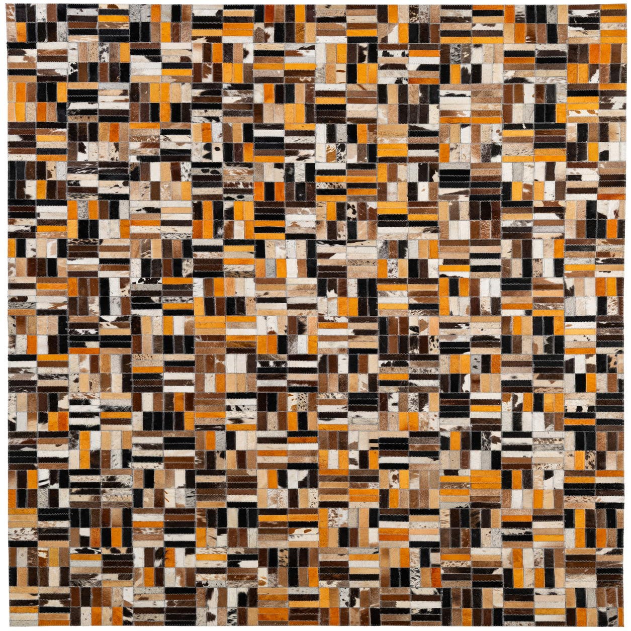A rectangular 5x8 multi-colored patchwork cowhide rug, featuring a modern stripe pattern in various shades of brown, black, white, and orange.