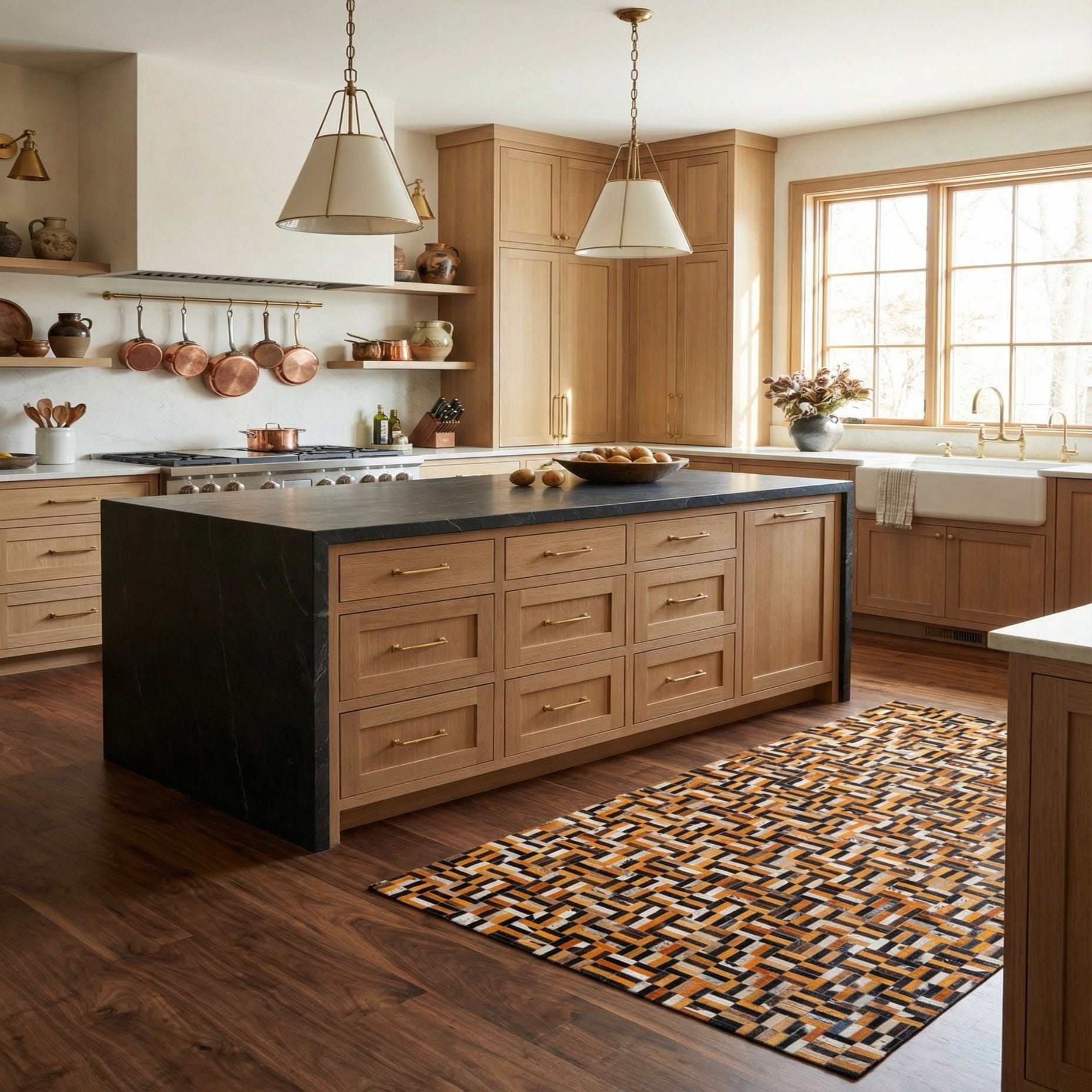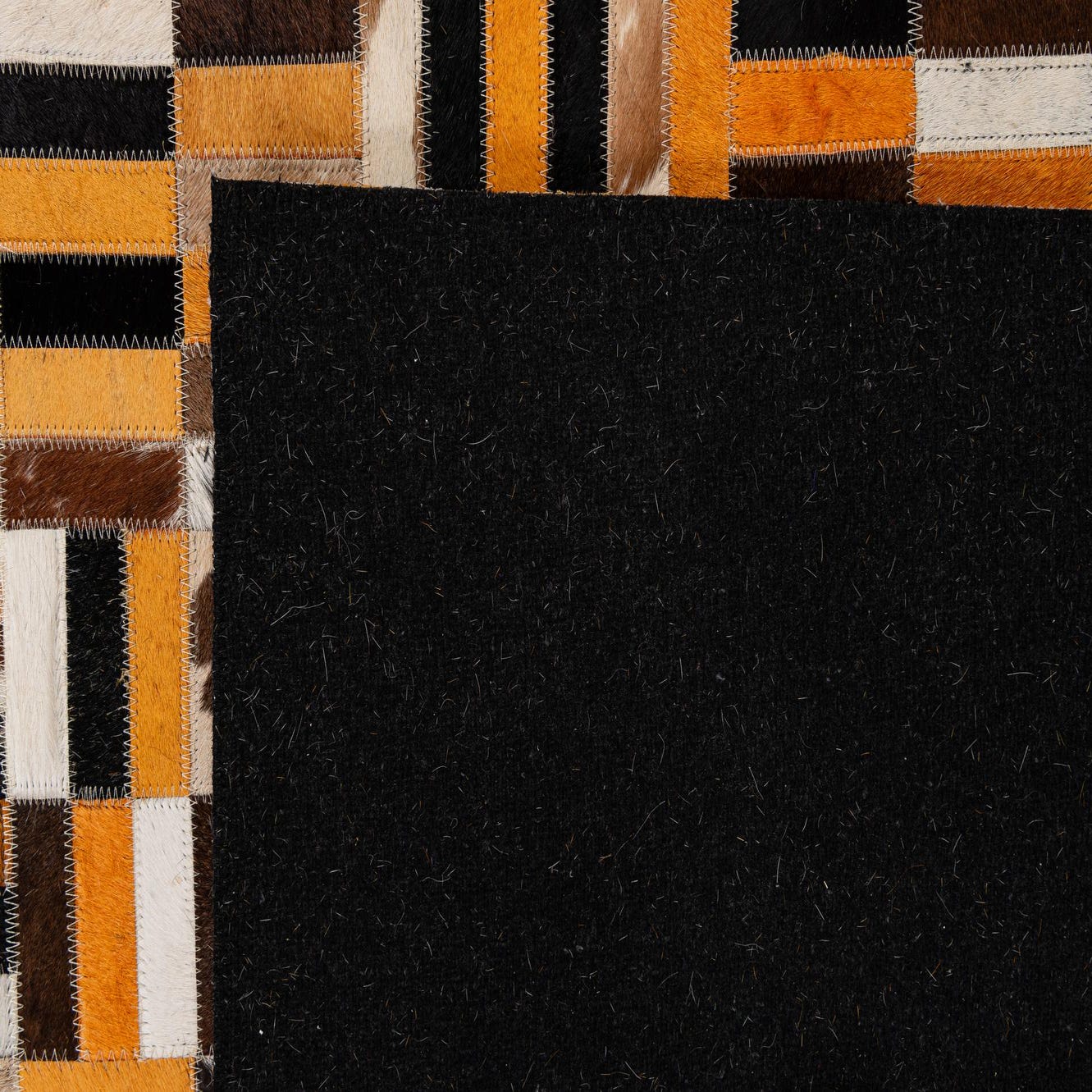 A 5x8 rectangular patchwork cowhide rug with a modern stripe pattern in black, brown, white, and orange tones.