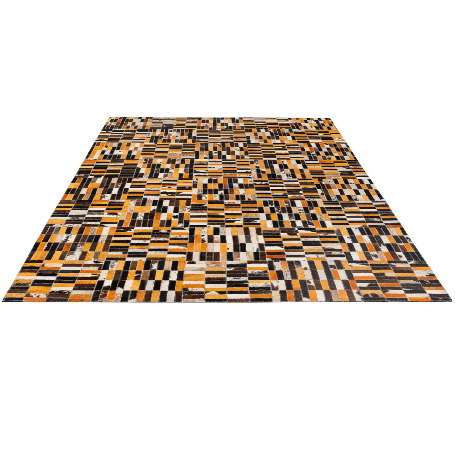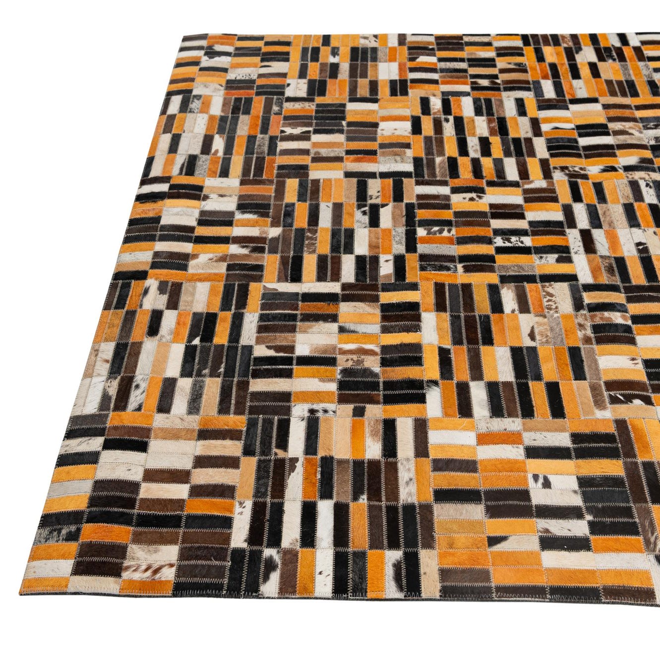 A rectangular 5x8 modern patchwork cowhide rug featuring a vibrant multi-colored pattern of orange, black, white, and brown rectangular pieces.