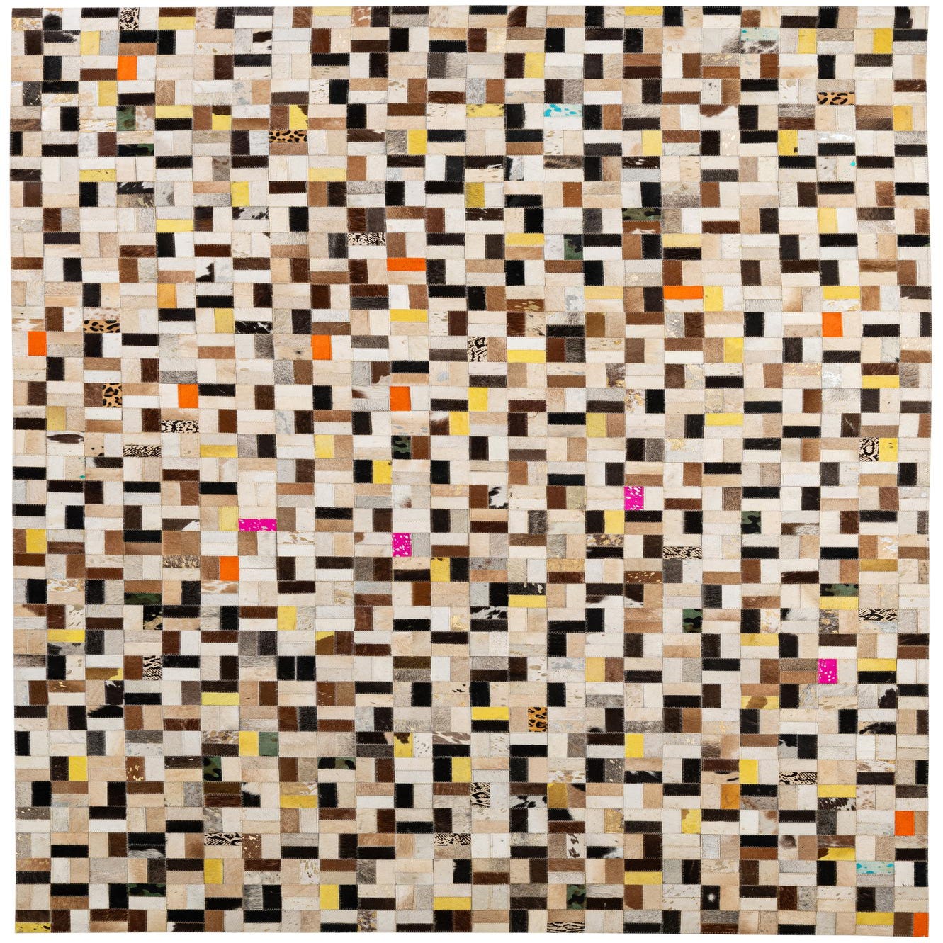 A 5x8 rectangular Cowhide Patchwork rug featuring a modern, multi-colored pattern with various natural cowhide tones and vibrant accents.