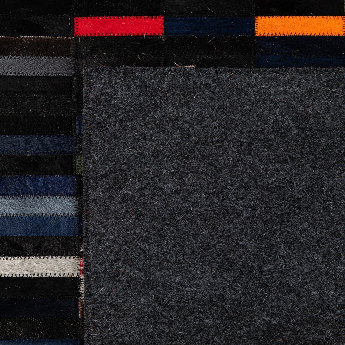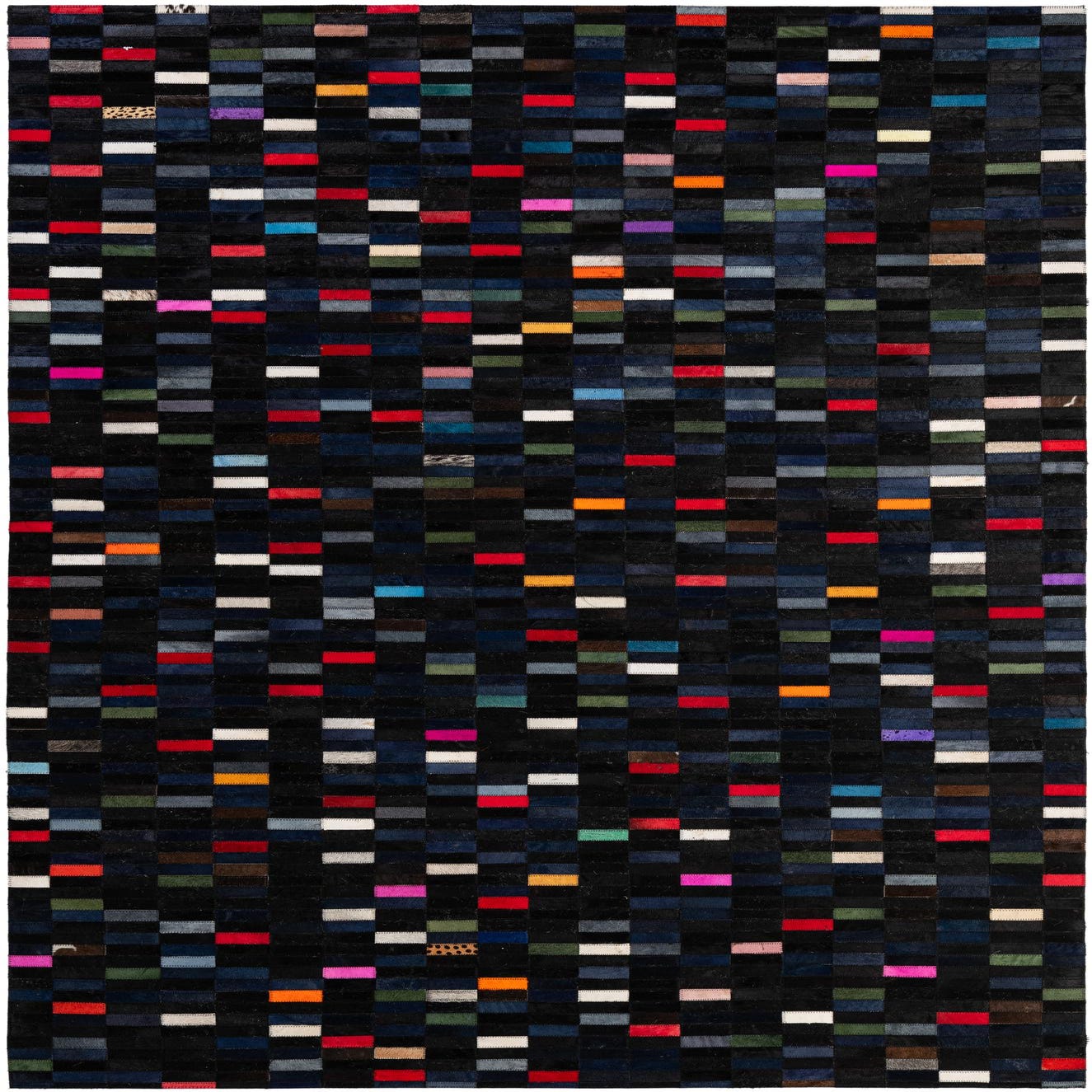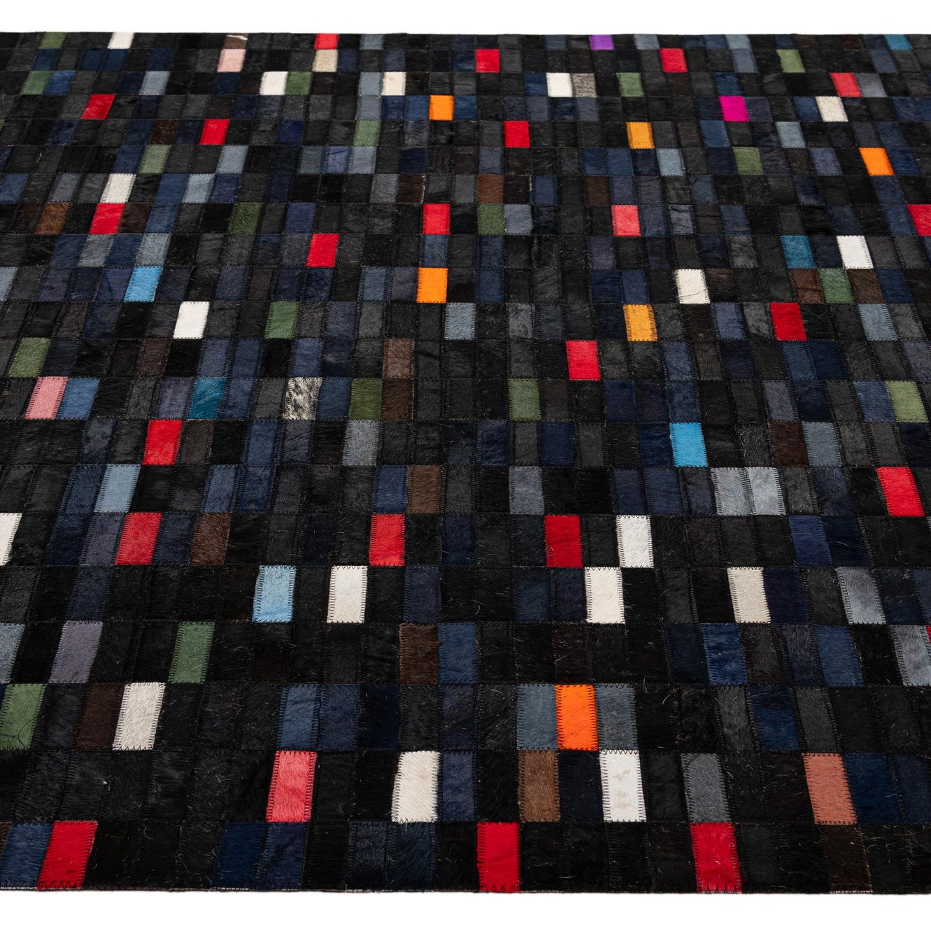 Handmade from cowhide and leather, this patchwork rug arranges narrow rectangular tiles into a compact, geometric field. The multi background is anchored by deep black and navy tones, while bright accents — red, pink, orange, yellow, purple, green, blue and light blue — and touches of ivory create a lively, rhythmic pattern. The staggered grid of color bars has a modern, mosaic-like presence that adds visual movement without overpowering a room.