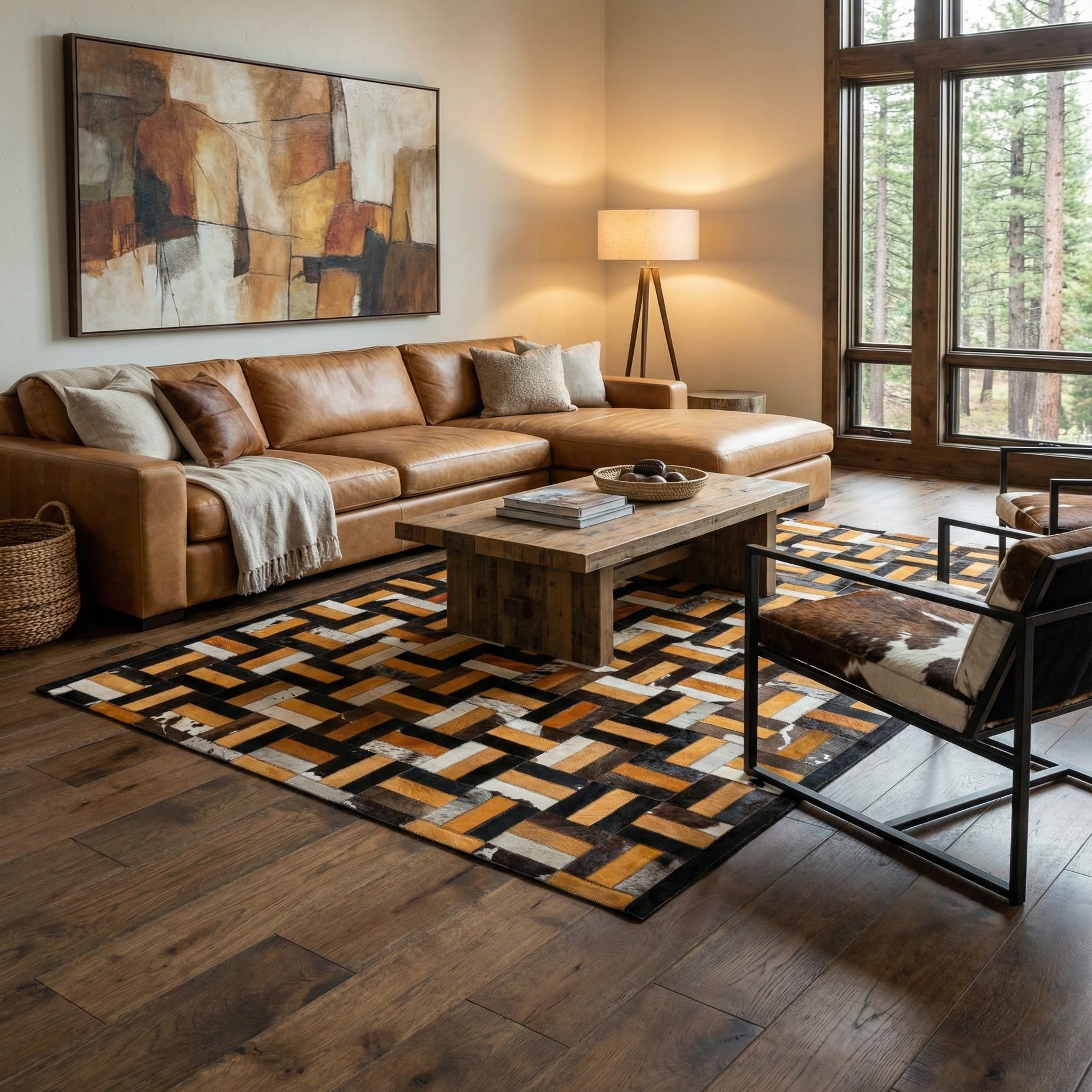 A rectangular 5x8 modern patchwork cowhide rug featuring a geometric pattern of multi-colored stripes in black, brown, white, and various shades of orange and tan.
