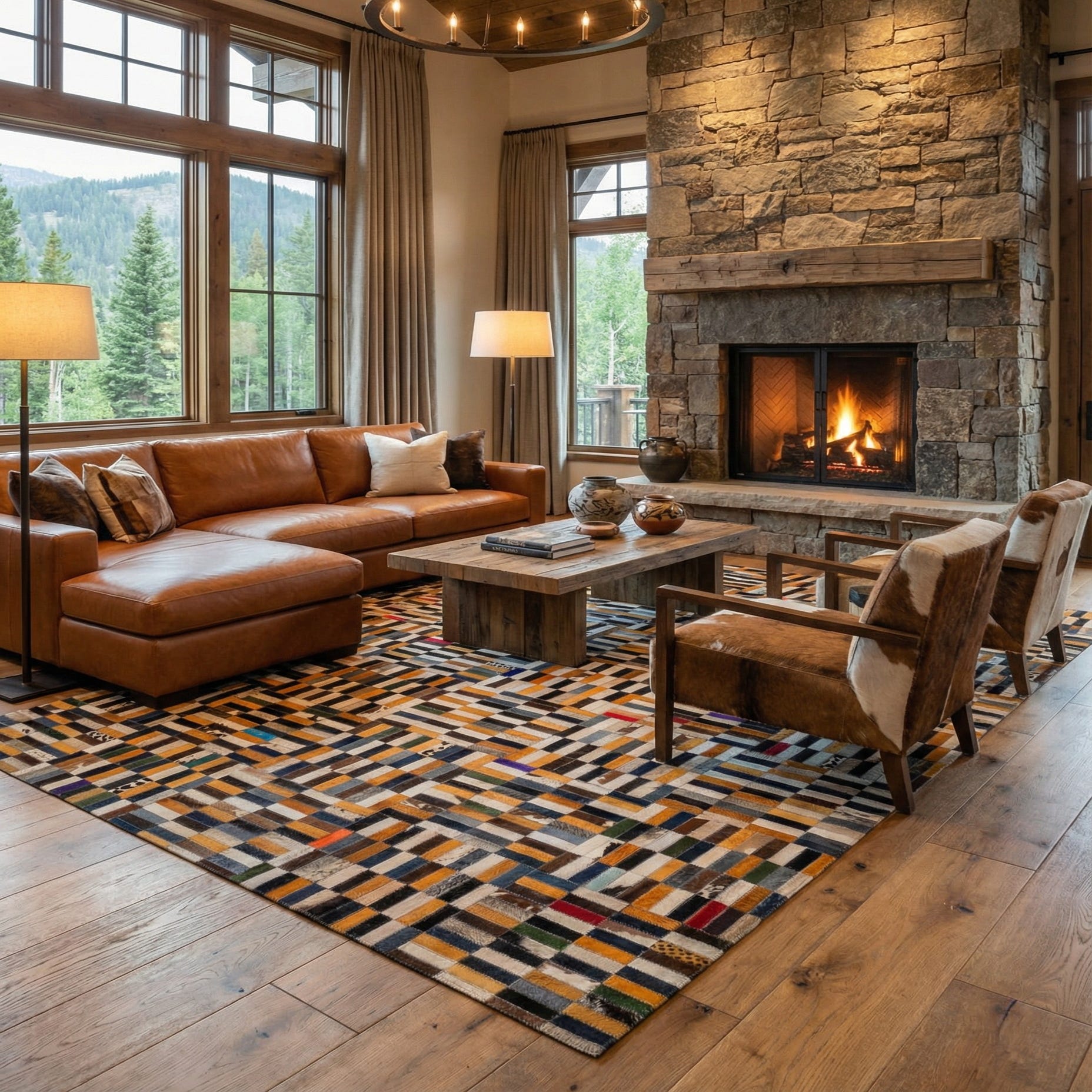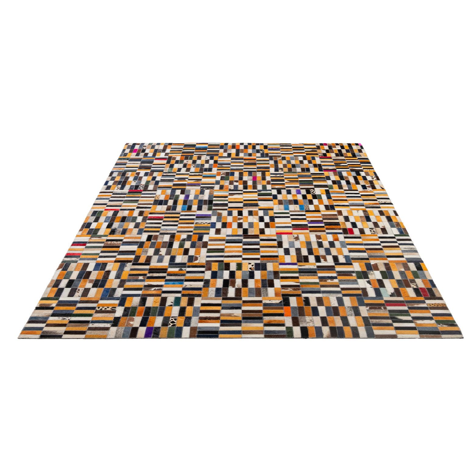 A 5x8 multi-colored rectangular cowhide patchwork rug with a modern stripe pattern, ideal for a living room.