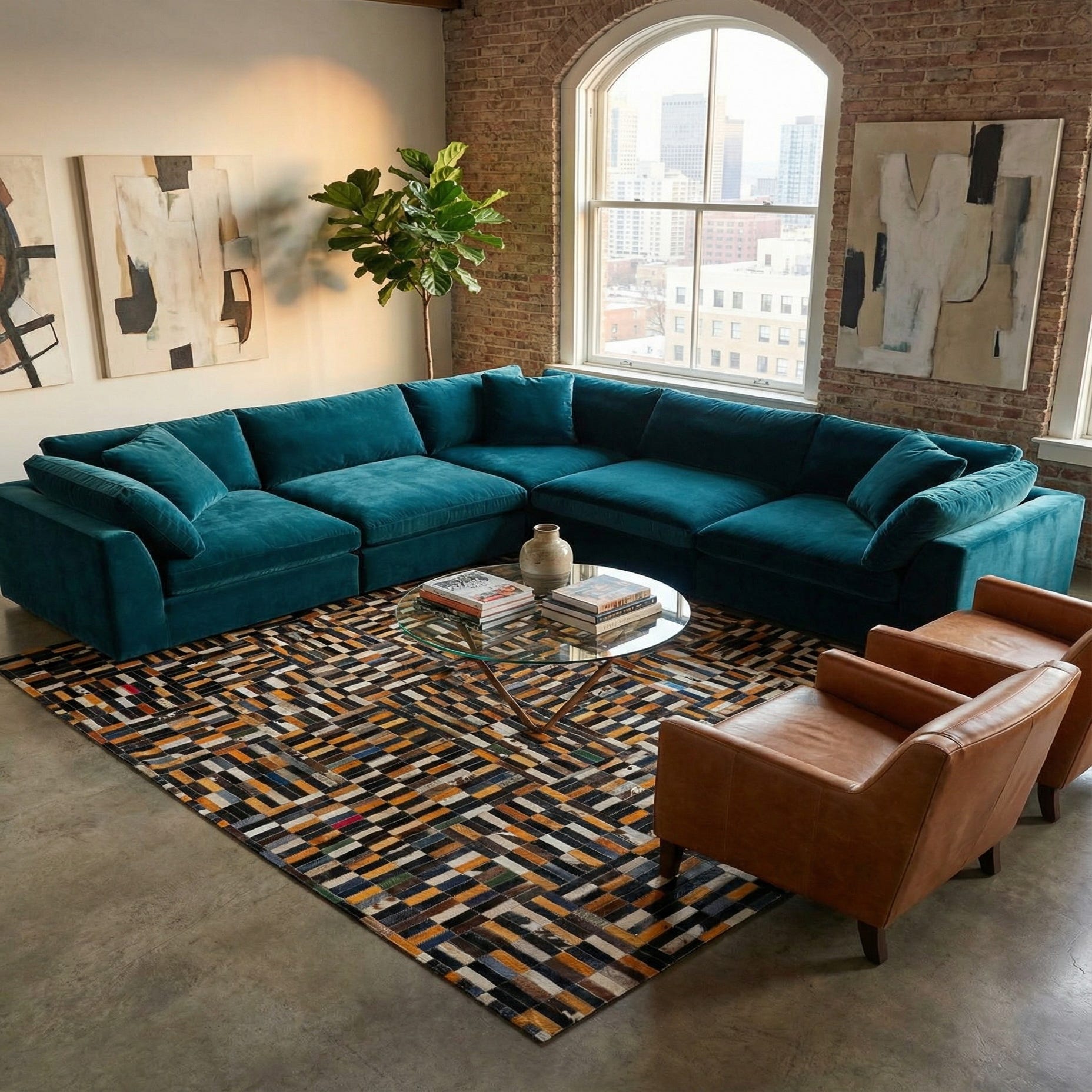 A 5x8 rectangular Cowhide Patchwork rug featuring a modern stripe pattern in multi-colored hues, ideal for a living room.