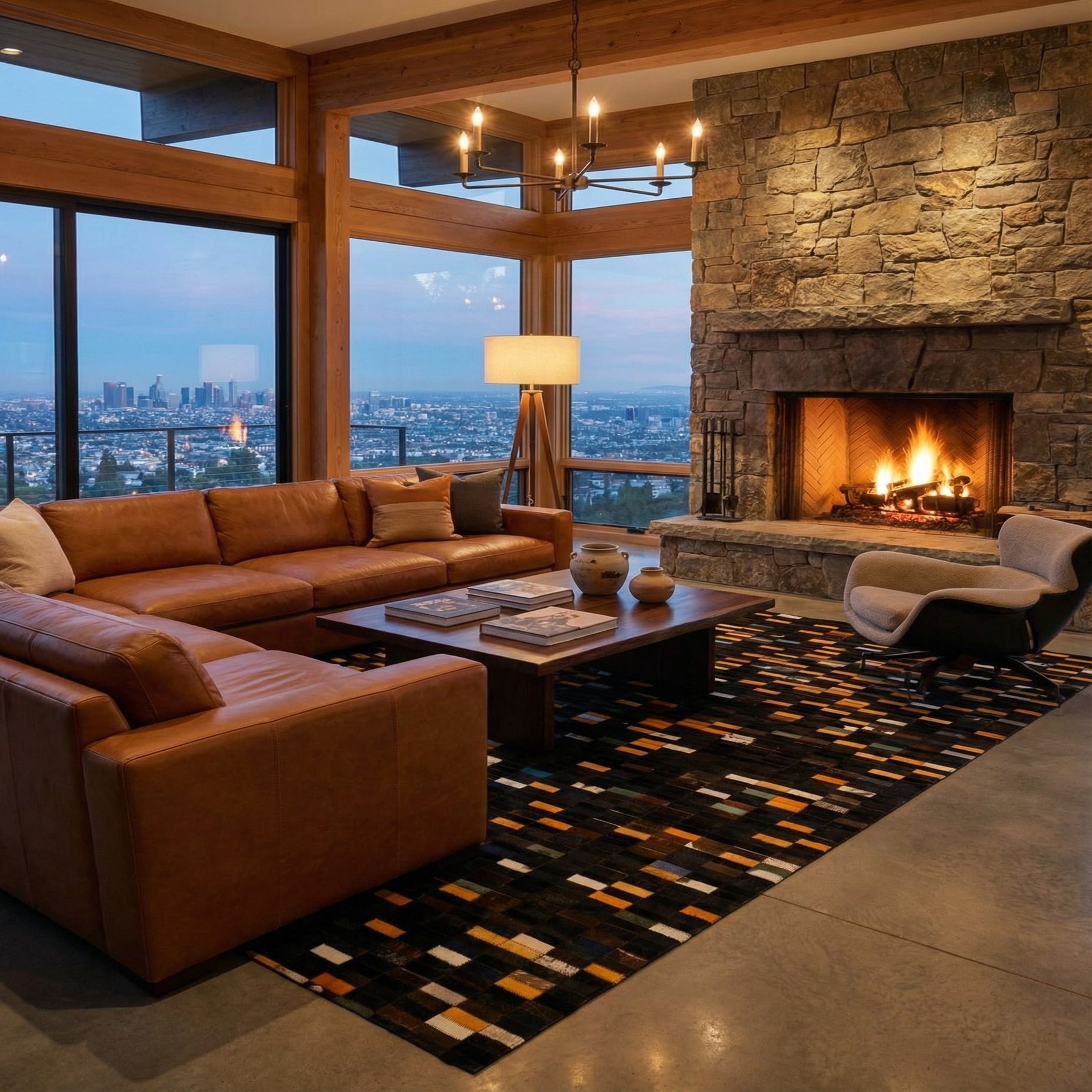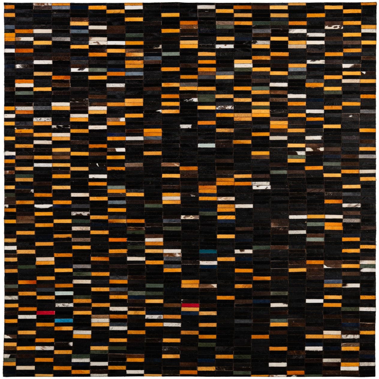 A rectangular 5x8 modern patchwork rug made of cowhide and leather, featuring a multi-colored design with black, orange, white, and various accent color rectangular patches.
