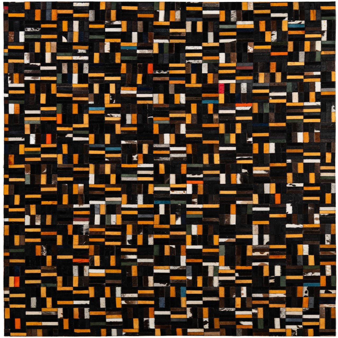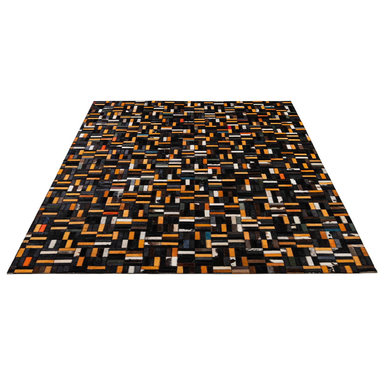 A rectangular 5x8 multi-colored modern rug made from cowhide and leather, featuring a patchwork stripe pattern in black, orange, white, and various accent colors.